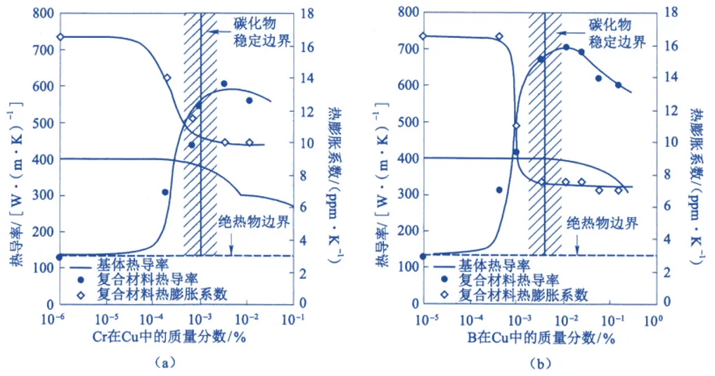 图10 合金元素对60% Diamond/Cu复合材料热导率和热膨胀系数的影响 (a)基体中添加 Cr;(b)基体中添加 B
