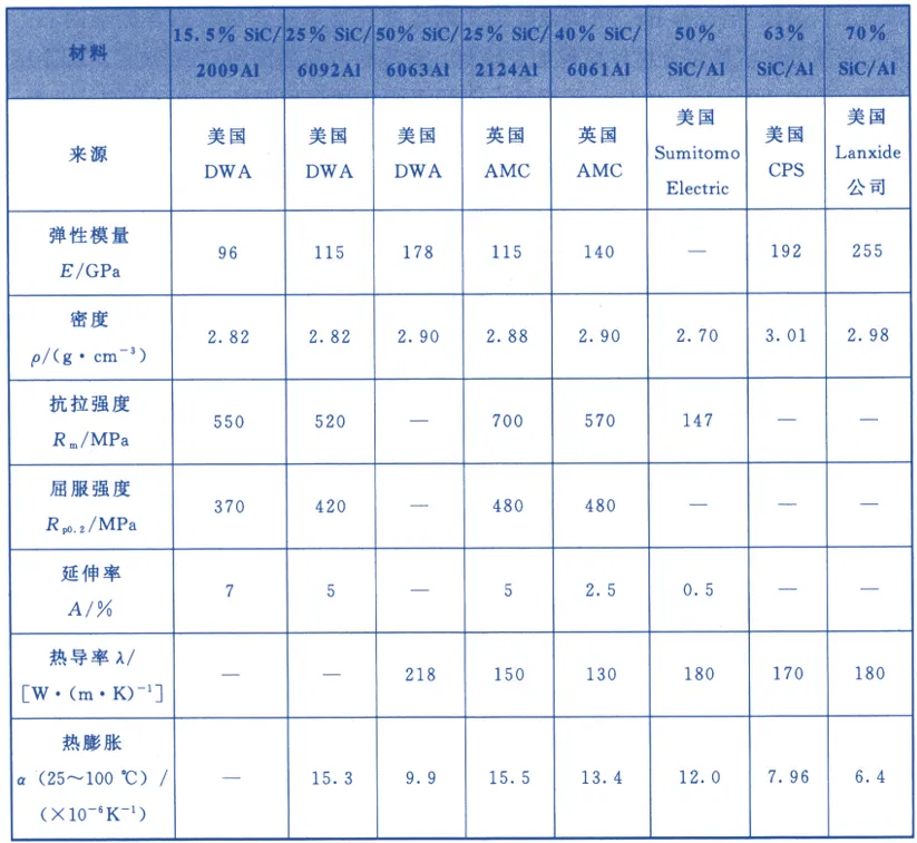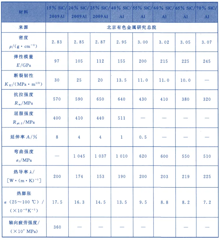 表4列出了具有代表性的 SiC/Al复合材料与常规材料的性能对比。