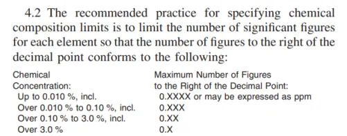3. 当单个化学元素的百分含量大于0.10%,且不大于3.0%时,小数点之后的最大有效位数应是2位;