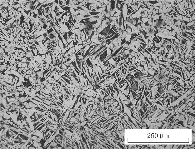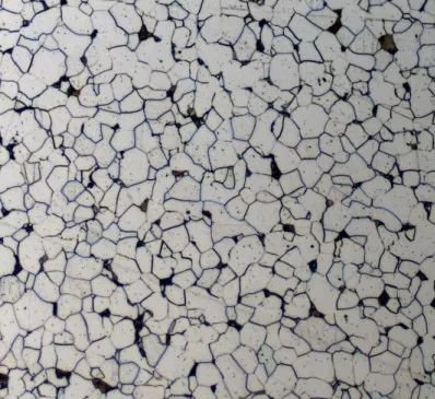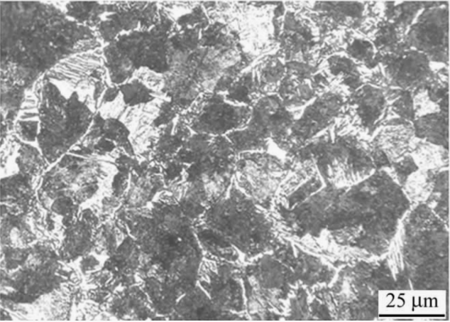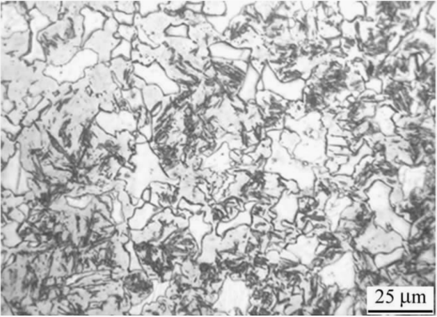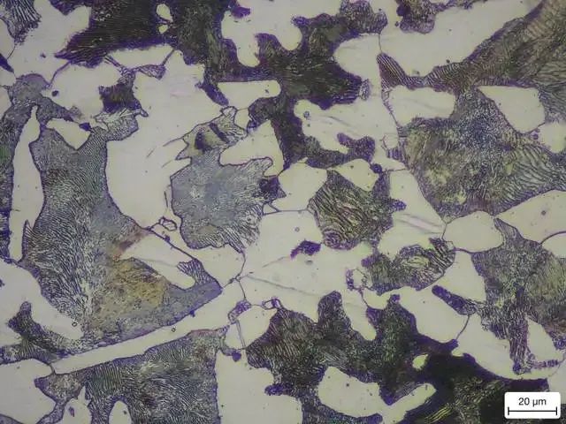 01 前 言 铁素体: 纯铁在912℃以下是具有体心立方晶格的α-Fe,碳溶于α-Fe中的间隙固溶体称为铁素体,用符号F表示。 由于α-Fe的体心立方晶格间隙直径很小,碳在其中溶解度极小,600℃时其溶解度仅为0.0057%,在727℃时达到最大溶解度,但也仅为0.0218%。 因此,铁素体的力学性能几乎与纯铁相当,其塑性、韧性好(A≈30%-50%,KU≈128-160J),而强度、硬度低(Rm≈180-280MPa,50-80HBW)。铁素体在770℃以下时具有铁磁性,在770℃以上则失去磁性。 图1 铁素体显微组织 如图1所示,铁素体的显微组织为明亮的多边形晶粒,晶界处易于腐蚀,呈不规则的黑色线条。 而铁素体因选择的热处理工艺的不同,在材料中又常常呈现出不同的形态,若无足够的经验,是很容易混淆的。本期的文章主要是和大家分享“未溶铁素体和先共析铁素体”的区别。 02 未溶铁素体和先共析铁素体 未溶铁素体是亚共析钢加热到Ac1-Ac3之间淬火后(即欠热淬火)得到的显微组织,为白色多角状并具有明显的晶界,马氏体和残余奥氏体基体稍暗,微调聚焦会发现白色未溶铁素体与马氏体在同一个平面上。 如图2所示为45钢760℃保温30min水淬后的显微组织形貌,其中的白色多角状相是未溶铁素体,灰白色相是淬火马氏体和残余奥氏体,深色相是板条马氏体。 图2 白色多角状未溶铁素体 先共析铁素体是亚共析钢加热到Ac3以上淬火时,由于冷却速率较慢,在晶界处先析出的白色网状组织,显微组织中往往还有黑色球团状的淬火屈氏体。 如图3所示为45钢880℃加热保温30min油淬后的显微组织形貌,由于冷却速率小于临界冷却速率,由淬火时沿晶界析出的白色细网状先共析铁素体、深色淬火屈氏体、灰白色马氏体以及少量沿晶界的羽毛状上贝氏体组成。 图3 白色细网状先共析细素体 03 铁素体图集