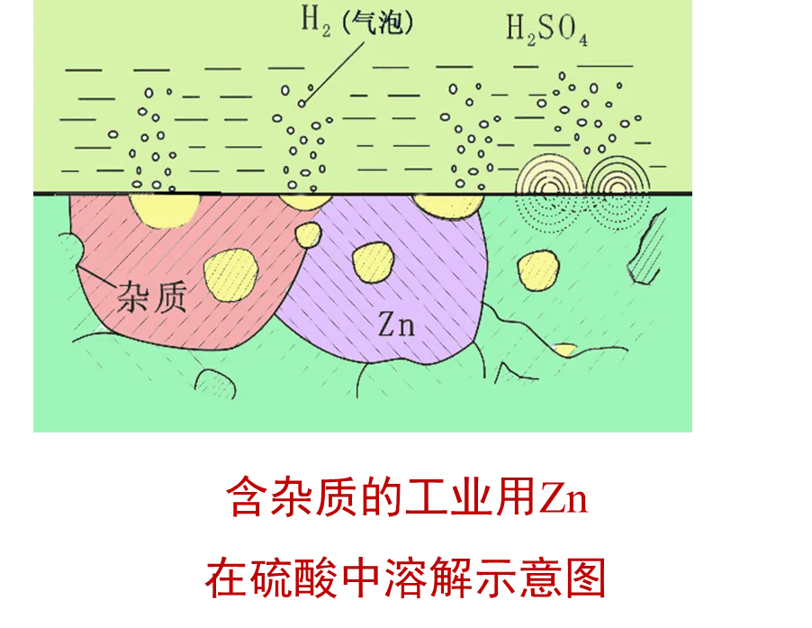 含有杂质的金属表面,由于金属和杂质的电势的差异,容易构成以金属和杂质为电极的许多微电池(或局部电池)。氢离子在铁阴极上放电,锌作为阳极不断溶解而受到腐蚀。所以,含有铁杂质的粗锌在酸性溶液中,既有化学腐蚀,又有电化学腐蚀,要比纯锌腐蚀得更快。
