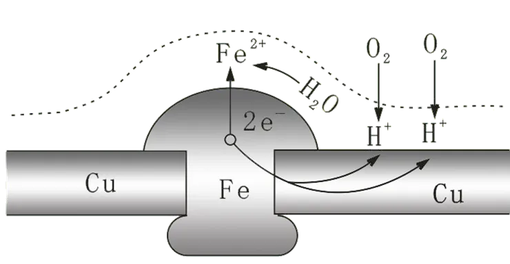 均匀腐蚀:金属表面均匀受损,腐蚀程度在整个表面上较为一致。点蚀:在金属表面形成局部的小洞,常在不锈钢等合金材料中见。缝隙腐蚀:在金属与金属或与非金属的接触界面形成的狭窄缝隙中发生的局部腐蚀。应力腐蚀开裂:金属在受到拉伸应力和特定腐蚀介质的双重作用下发生的裂纹,进一步导致破坏。晶间腐蚀:集中在晶界区域的腐蚀,容易导致材料断裂。选择性腐蚀:合金中的某种元素比其他元素更容易腐蚀,导致组成发生变化。按照发生化学反应的类型,可以分为化学腐蚀和电化学腐蚀。金属表面与介质(如气体或非电解质液体等)因发生化学作用而引起的腐蚀,称为化学腐蚀。化学腐蚀作用进行时无电流产生。金属表面与介质(如潮湿空气或电解质溶液等)因形成微电池,金属作为阳极发生氧化而使金属发生腐蚀,这种由于电化学作用引起的腐蚀称为电化学腐蚀。当两种金属或者不同的金属制成的物体相接触时,同时又与其它介质相接触时,就形成了一个原电池,并进行原电池的电化学作用。带有铁铆钉的铜板若暴露在空气中,表面被潮湿空气或雨水浸润,空气中的CO2、SO2和海边空气中的NaCl溶解其中,形成电解质溶液,铜作阴极,铁作阳极,这样组成了原电池。