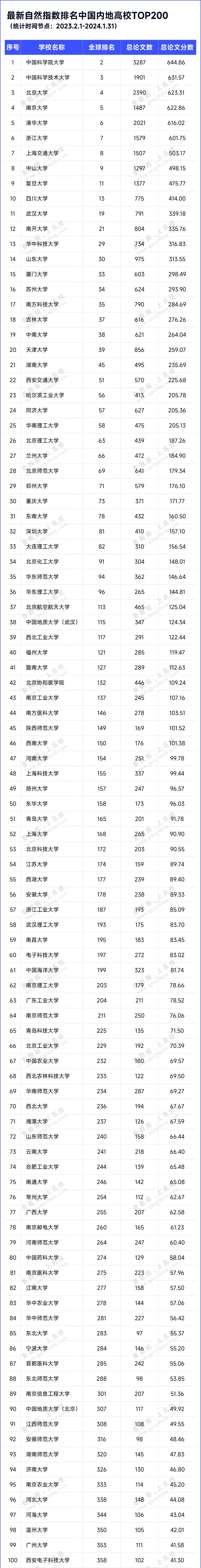 最新自然指数排名中国内地高校TOP200名单如下: