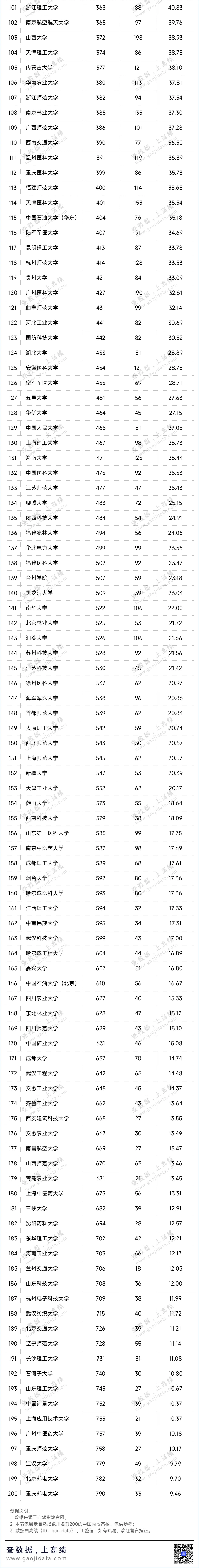非“双一流”高校中,深圳大学、南京工业大学、南方医科大学、扬州大学、青岛大学、江苏大学、西湖大学和浙江工业大学表现优异,位居全球高校前200。