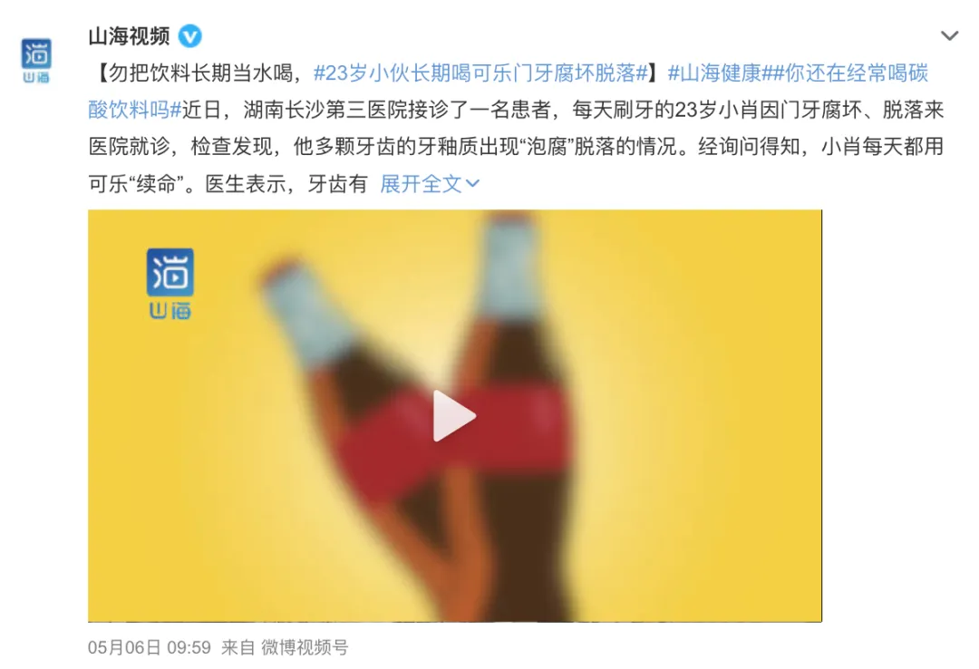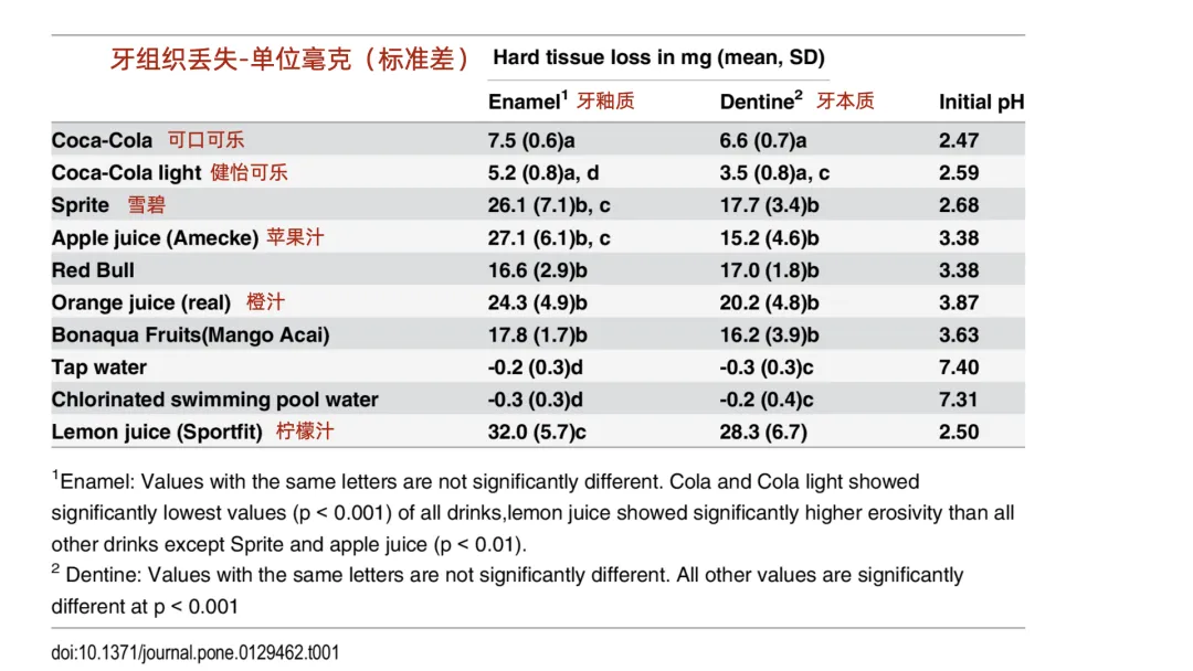 1. “腐蚀”牙齿,柠檬汁、雪碧、苹果汁、橙汁比可乐更厉害。 2. 怎么喝少伤牙:吃饭时喝、用吸管、喝完漱口、半小时后再刷牙。 进入盛夏,冰镇碳酸饮料的诱惑越来越难抵挡了。 有些人听说碳酸饮料会腐蚀牙齿,甚至会喝出“可乐牙”,于是跑来问我:换成无糖的是不是就好了。 我:确实好很多,但也还是有影响,毕竟还有那么多酸呢 饮料是怎么“腐蚀”牙齿的? 用酸、用糖 能“腐蚀”牙齿的饮料,主要从两方面危害牙齿:饮料中的酸对牙齿表面的酸蚀、破坏,“可乐牙”多是这种情况;饮料中的可发酵糖(可分解为葡萄糖、果糖这样单糖的碳水化合物)扩散到牙菌斑,经口腔细菌发酵产酸引起龋齿。[1] 对牙齿的伤害最终都是由酸来完成的,只是糖需要经细菌发酵产酸,而饮料中的酸是直接“腐蚀”牙齿,医学术语为“酸蚀症”。 高能预警:向左滑动,查看“可乐牙” 含“酸”的饮料有哪些? 碳酸饮料、果汁、葡萄酒、运动饮料,为了保持新鲜和发泡的口感、防止细菌快速生长,几乎都是酸性的(pH < 4.0),它们与牙齿接触后,牙齿表面的pH快速下降,导致牙釉质脱矿软化。[2][3] 牙釉质是牙齿最外层乳白色半透明的“壳”,是人体最坚硬的组织,保护着里面的牙本质和牙髓组织不受外界刺激。 牙釉质虽硬,但怕酸、怕磨、还脆……如果牙釉质受损,会导致牙本质敏感、牙髓炎,甚至出现牙齿折断、咬合关系紊乱等。 牙釉质为啥怕酸? 牙釉质的主要成分是羟基磷灰石( Hydroxyapatite,缩写HA,化学式:Ca10(PO4)6(OH)2),它微溶于水,能分解出钙、磷酸盐和羟基。 接近中性环境(唾液 pH 为6.6-7.1)时,牙釉质在唾液的作用下保持着脱矿、再矿化的平衡,不会溶解在唾液里。[2] 图片来源:参考资料[2] 而 pH 每降低一个单位,HA 的溶解度就会增加 10 倍左右。pH =7.0 时,HA 的溶解度只有 30mg/L,pH =4.0时,HA 的溶解度增加到了 30g/L。[2] 当你喝了可乐、果汁等酸性饮料,牙釉质表面的pH变为酸性,脱矿、再矿化的平衡会转向脱矿,牙釉质的表面硬度也会降低,也就是说它被酸溶解、软化了…… 软化了还能硬回来吗? 能! 我们的唾液是最好的“pH缓冲剂”,能让口腔内的 pH 快速恢复正常。pH回升,羟基磷灰石的溶解度降低,牙釉质由脱矿转为再矿化,溶解出去的钙、磷酸又都沉淀回去了,硬度也会恢复。 但你要是每天持续大量喝酸性饮料,超出唾液的缓冲能力,牙釉质一直处于脱矿反应中,“可乐牙”也就不远了,而一旦牙釉质被酸侵蚀,就再也不能恢复了…… 图片来源:@山海视频 微博截图 谁是真正的“腐蚀酸”饮料? 拜“碳酸饮料腐蚀牙齿”、“可乐牙”的宣传所赐,大家似乎都觉得碳酸就是腐蚀牙齿的罪魁祸首,可乐是最腐蚀牙齿的饮料。 事实并非如此。 酸的 pH 够低才行 一般来说 pH5.5 是牙釉质的脱矿的一个临界值,低于这个值,牙釉质会走向脱矿。 碳酸饮料(汽水)是在一定条件下充入二氧化碳的饮料(不包括由发酵法自身产生二氧化碳的饮料)。[7] 碳酸是一种弱酸,常温常压下,二氧化碳饱和溶液的 pH 为5.6,还略高于牙釉质脱矿的临界值。再考虑到碳酸不稳定,若分解为二氧化碳和水,其pH 还会进一步升高。所以,它很难在牙釉质的酸蚀过程中发挥作用。 磷酸、柠檬酸才是罪魁祸首 磷酸、柠檬酸就不一样了,这两种酸相对稳定且酸性较强,是饮料中最常用的两种膳食酸,添加这两种酸的饮料,pH 可低至2左右。[4] 因此,磷酸、柠檬酸才是真正的“腐蚀酸”![3][5][6] 而柠檬酸比其他酸更容易溶解牙釉质,原因是除了它的酸度作用外,柠檬酸还能跟钙结合形成复杂的柠檬酸钙,唾液中高达 32% 的钙都能被柠檬酸盐结合,从而降低了唾液中钙的饱和度,增加对牙釉质的腐蚀力。[3] 钙、磷含量少,饮料“腐蚀力”强 酸性饮料的“腐蚀力”并不完全取决于 pH,饮料中钙和磷酸盐的含量也是重要的影响因素。 虽然牙釉质脱矿的 pH 临界值一般为 5.5,实际上,唾液中钙、磷酸盐含量较低的人,牙釉质可能在 pH6.5 就已经开始脱矿,唾液中钙、磷酸盐含量较高的人,牙釉质可能到 pH5.1 才开始脱矿。 饮料也是同理。 已经有研究表明,在低 pH 的黑加仑果汁、橙汁和运动饮料中添加钙可以减少饮料对牙釉质的腐蚀作用。像酸奶的 pH 为 4.0,但由于其富含钙和磷酸盐,几乎不会对牙釉质产生什么侵蚀。 因此,钙、磷酸盐含量更少的酸性饮料,对牙齿的腐蚀力也会更强。 不过,就算通过提升磷酸盐含量避免喝的时候侵蚀牙齿,如果摄入过多的磷仍会影响钙的吸收,铁、锰、锌等矿物质的利用也会受影响,最终还是会影响到牙齿健康。 可乐居然不是“腐蚀酸”饮料的王者 虽然新闻都是喝可乐喝出“可乐牙”,但中外的试验都发现在“腐蚀”牙齿这件事上,可乐并不是什么王者。 国内的试验,酸性饮料 pH 接近时,钙磷含量双低的“冰茶*”才是真正“腐蚀牙齿”的魔头,雪碧紧随其后,可口可乐与百事可乐敬陪末座……[1] *提醒:这里提到的“冰茶”,是研究者在当地超市随机购买的 5 种碳酸饮料之一,只是产品名字叫“冰茶”,不是冷泡茶、冻奶茶、冰红茶,更不是国外的冰茶(Ice Tea)。 图片来源:参考资料[1] 国外试验中,柠檬汁的“腐蚀力”最强,是健怡可乐的 6 倍,雪碧、苹果汁、橙汁位于第二梯队,“腐蚀力”约是健怡可乐的5倍。[8] 图片来源:参考资料[8] 咖啡与茶:另类的龋齿攻势 咖啡与茶,如果没有额外添加酸性成分的话,通常来说是弱酸性饮料,咖