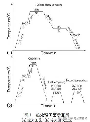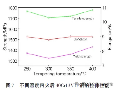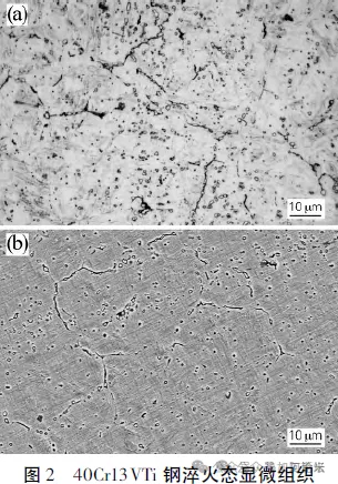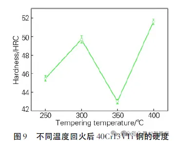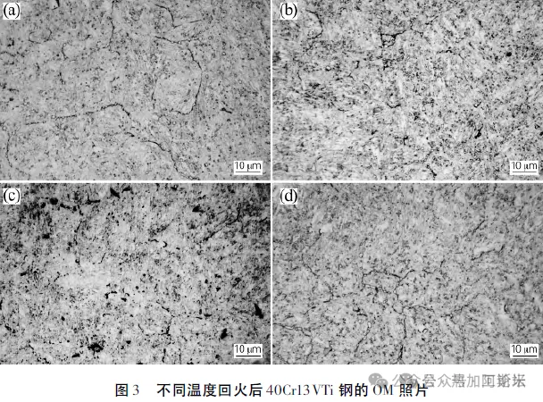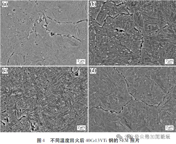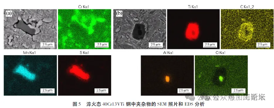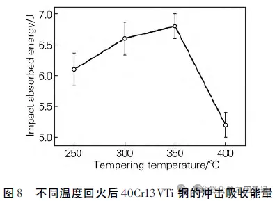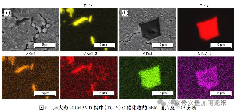 目前,家用刀具的主要材料有碳钢、弹簧钢和马氏体不锈钢等。3Cr13 和4Cr13 马氏体不锈钢是广泛使用的切削材料,这两种不锈钢的优点是耐蚀性好,但耐磨性差,使其锋利性保持时间短。这就要求开发具有成本效益的马氏体不锈钢材料。在此基础上,试验了马氏体不锈钢合理的热处理工艺体系。 为了开发高性价比的刀具材料,可采用微合金化结合优化热处理的方法开发具有更高性价比的新型刀具材料。因此,本文主要是对含V、Ti 的40Cr13钢进行热处理试验,通过对钢的组织和性能分析,确定试验钢的最佳热处理工艺,最终为40Cr13VTi 不锈钢刀具的热处理生产提供工艺参考。 40Cr13VTi 钢的化学成分( 质量分数,%) 为0.38C、1.5Si、0. 8Mn、13Cr、0.2Ti、0.2V、0.6Ni。采用25 kg 的真空感应熔炼炉进行熔炼。铸锭随后锻成Φ47mm×1000 mm 的长棒试样供试验使用。锻后的长棒先进行球化退火,试样随炉升温至800℃保温30min 后,继续升温至860℃保温90min,再随炉缓慢冷却至750℃保温90min,再以25~30 ℃/h 的冷却速度降至550℃,最后出炉空冷,退火工艺路线如图1( a) 所示。试验钢在1030℃保温30 min 后进行油冷,最后分别在250、300、350、400 ℃进行两次回火试验,其工艺路线如图1( b) 所示。 将热处理后的试样磨制并抛光后,采用质量分数为19.7% 的FeCl3腐蚀剂进行腐蚀,利用光学显微镜(OM) 、扫描电镜(SEM) 和能谱仪对试样进行组织观察及EDS 分析; 室温拉伸试验按GB/T 228.1—2021《金属材料拉伸试验第1 部分: 室温试验方法》在万能试验机上进行,选用d0=5 mm 的R7 棒状试样,取3 个平行试样进行测试; 冲击试验采用“V”型缺口试样,试样尺寸为10 mm ×10 mm ×55 mm,缺口深度2 mm,试验在冲击试验机上按GB/T 229—2020《金属材料夏比摆锤冲击试验方法》进行,取3 个平行试样进行测试。 试验钢淬火后的显微组织如图2 所示,可以看出,马氏体板条束呈现平行排列,并存在大量尺寸为1~2 μm沿铁素体晶界分布的颗粒物,根据图2 的显微组织和EDS 能谱分析结果,判断其为Cr 系碳化物。该类碳化物一般认定为( Fe,Cr)23C6。由于淬火马氏体的C、Cr 含量较高,大大增加了晶格正方度,导致其性能极不稳定。 4Cr13 钢为中碳高合金钢,大量的合金元素提高了钢的回火抗力,使淬火马氏体分解温度提高,在较高温度回火时仍能保持原马氏体形貌8]。图3 为试验钢不同温度回火后的OM 照片,可见在较高温度回火时仍为回火马氏体。在较低温度回火时,只有碳、氮原子可以近程扩散发生化学偏聚,形成过饱和碳化物,回火温度稍微升高,部分过饱和碳化物中的碳析出形成少量合金渗碳体。从图3( a~d) 可以看出,低温回火时,马氏体基体析出碳化物较少,呈弥散分布,回火温度升高,碳化物析出逐渐增多,形状逐渐由颗粒状转变为片状,与原马氏体板条方向一致且多集中在马氏体边界。 由于试验的回火温度未到达使马氏体大量分解的温度,因此马氏体板条束形貌都比较明显。在300℃以上回火时,碳化物大量析出。 由图4 可以看到,在较低温度回火时,碳化物的析出相对较少,随着回火温度的升高,基体内开始析出大量碳化物,并发生长大。此外,V、Ti 元素的加入能有效减少晶界上二次碳化物的析出,使得在光学显微镜下晶粒的轮廓较为模糊,在扫描电镜上也能看到碳化物的数量较淬火态明显减少。2. 2 夹杂物与不规则碳化物 通过扫描电镜观察发现,在淬火态试验钢中存在较多夹杂物,包括MnS 夹杂、Al2O3夹杂物等,如图5(a) 所示。在熔炼过程中,先形成尺寸约为4μm 短棒状的MnS夹杂,Cr系碳化物将依附其生长析出。图5( b) 显示了在基体中存在的Al2O3夹杂物,形貌为圆球状,尺寸约为1.2 μm,TiC 碳化物以其为核心生长析出,形成一种典型的“核壳”结构,其尺寸约为4.5 μm。此类夹杂物的存在极大地影响了试验钢的冲击性能。 此外,在基体中还存在较多的( Ti,V) C 复相碳化物,其形貌为短棒状和多边形,尺寸大多在1~10 μm之间,如图6 所示。2.3 力学性能 图7为不同温度回火后试验钢的拉伸性能。由图7可知,随着回火温度的升高,抗拉强度先降低再逐渐升高,在300℃回火过程中抗拉强度最低,为1705MPa; 屈服强度与抗拉强度有着类似规律,随着回火温度升高到300 ℃呈现最低值,再随着回火温度的升高基本均呈上升趋势。 从图7 可以看到,40Cr13VTi 钢的断后伸长率随着回火温度的升高先略微降低再升高。 由图8可以看到,随着回火温度的升高,冲击性能先升高再降低,冲击吸收能量在5.2~6.8 J 之间,在350℃回火时出现最高值,为6.8 J,在400℃回火时出现最低值,为5.2 J。在250℃ 以上回火时,40Cr13VTi 钢具有较好的冲击性能。 图9 为40Cr13VTi 钢不同温度回火后的硬度。试验钢的硬度随着回火温度的升高,先升高再降低,最后再升高,在400℃回火后具有最高硬度,为51.6HRC。1) 40Cr13VTi 钢1030℃油淬再经两次回火后,马氏体板条形貌基本被保留,未发生明显分解。低温回火时,马氏体基体碳化物析出较少,呈弥散颗粒状分布,回火温度升高,基体内开始析出大量碳化物,并发生长大。2) 随着回火温度的升高,试验钢抗拉强度与屈服强度均先降低再升高,在300℃回火时抗拉强度和屈服强度均降低到最低值; 冲击吸收能量随着回火温度的升高先升高再降低,主要是由于随着回火温度的升高,析出的碳化物数量增加,其尺寸也有所增大; 随着回火温度的升高,40Cr13VTi 钢的硬度先升高再降低最后又升高,在350℃回火时出现最低硬度,400℃