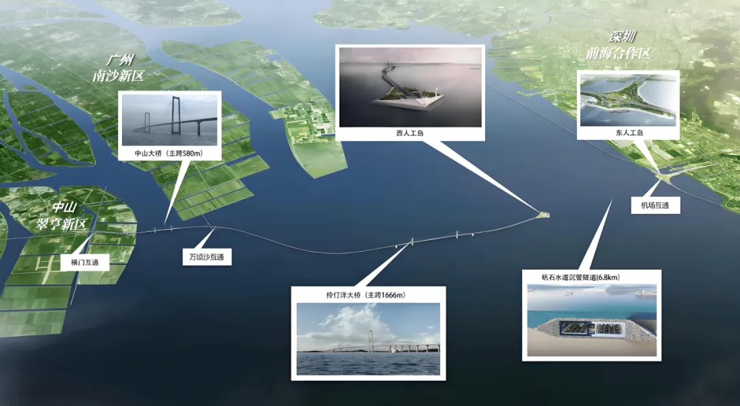 其中桥指的是位于中山右侧的伶仃洋大桥,中山大桥及东非通航孔桥等几座大桥,岛则指的是位于中山市和深圳市之间的海上修建的东西两座人工岛,隧是指整个工程中最难的海底隧道,水下互通则指靠近深圳的东人工岛所建立的水下直连机场的互通设施。
