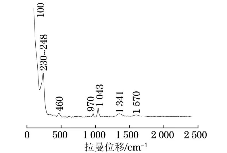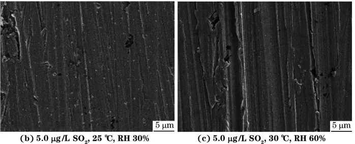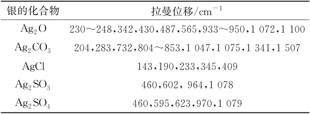 结 论 SO2气体会促进银的腐蚀,且腐蚀速率随着其含量的增加而加快;环境温度和相对湿度的升高也会加剧SO2对银的腐蚀作用。SEM-EDS和拉曼光谱分析进一步证实了此结论,在SO2环境中,银表面的氧元素和硫元素增多,表面有少量的颗粒状腐蚀产物生成,温湿度增加,腐蚀产物增多,这些腐蚀产物可能为Ag2O、AgCl、Ag2CO3、Ag2SO3以及Ag2SO4。