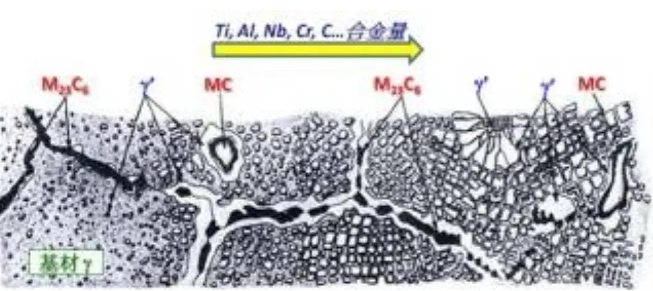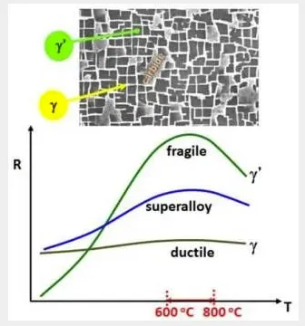 随着合金化程度的提高,其显微组织的变化有如下趋势:γ'相数量逐渐增多,尺寸逐渐增大,并由球状变成立方体,同一合金中出现尺寸和形态不相同的γ'相。此外,在铸造合金中还出现在凝固过程中形成的γ+γ'共晶,晶界析出不连续的颗粒状碳化物并被γ'相薄膜所包围,这些微组织的变化改善了合金的性能。此外,现代镍基合金的化学成份十分复杂,合金的饱和度很高,因此要求对每个合金元素 (尤其是主要强化元素)的含量严加控制,否则会在使用过程中容易析出其他有害的介金属相,如σ、Laves相等,将损害合金的强度和韧性。