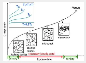 潜变为材料在高温(T/Tm>0.5)恒荷载作用下,缓慢地产生塑性变形的现象,为材料合金由于具有最佳的抗高温潜变能力,而被广泛的使用在各种高温环境,作为承力件应用。潜变的发生如图5。