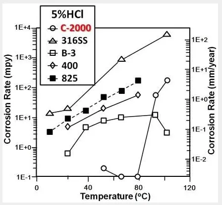 图8 不同合金在还原酸(HCl)中之耐蚀性质数据