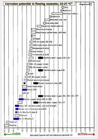 镍基合金中再添加含Mo与Cu等元素,则可增进保护对抗层还原酸之抗腐蚀能力,如Ni-Mo合金主要在还原性介质腐蚀的条件下使用,是耐盐酸腐蚀的最好的一种合金,但在有氧和氧化剂存在时,耐腐性会显着下降 。Ni-Cr-Mo(-W) 合金则兼有上述 Ni-Cr 与Ni-Mo合金的性能,主要在氧化与还原混合介质条件下使用,这类合金在高温氟化氢气中、在含氧和氧化剂的盐酸、氢氟酸溶液中以及在室温下的湿氯气中耐蚀性良好。含Mo镍基耐蚀合金之重要性在于可同时抵抗氧化酸与还原酸,如钛及不锈钢则只耐氧化酸,如哈氏C-276或C-2000合金就是一种含W的Ni-Cr-Mo合金,见图8: