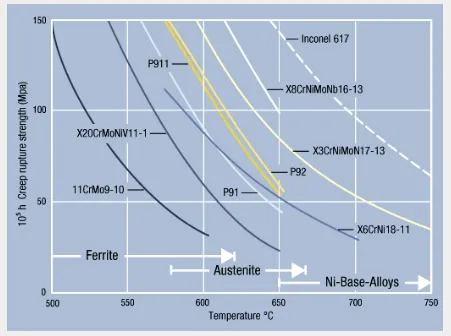 (3)晶界滑移:因高温时晶界较弱,材料易沿晶界产生滑移,造成沿晶裂缝。故高温时晶粒越小越容易产生晶界滑移潜变及沿晶裂缝。金属的潜变变形常为差排潜变与晶界滑移的交互作用,镍基合金由于具有介金属相的析出,可大幅抑制差排潜变,而晶界上析出的碳化物则可帮助抵抗晶界滑移造成之潜变现象,使得镍基合金相对其他金属材料具有较优异的抗潜变性质见图6: