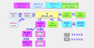 (3)晶界强化元素,如B、Zr、Mg和稀土元素等,可加强合金之高温性质。一般镍基合金的牌号由其所开发厂家来命名,如Ni-Cu合金又称为Monel合金,常见如Monel 400、K-500等。Ni-Cr合金一般称为 Inconel合金,也就是常见之镍基耐热合金,主要在氧化性介质条件下使用 ,常见如 Inconel 600、625等。若是Inconel合金中加入较高量的Fe来取代Ni,则为Incoloy合金,其耐高温程度不如镍基析出硬化型合金,但价格便宜,可用于喷射引擎里温度较低部份的组件及石化厂反应器等,如Incoloy 800H、825等。若于Inconel与Incoloy中加入析出强化元素,如Ti、Al、Nb等,则成为析出硬化型(铁)镍基合金,可于高温下仍保有良好的机械强度与抗蚀性,多用于喷射引擎的组件,如 Inconel 718 、Incoloy A-286 等。而 Ni-Cr-Mo(-W)(-Cu) 合金则称为哈氏耐蚀合金(Hastelloy),其中Ni-Cr-Mo主要在还原性介质腐蚀的条件下使用。Hastelloy的代表牌号如C-276、C-2000等。镍基合金之主要牌号与添加元素之对照可参考图2: