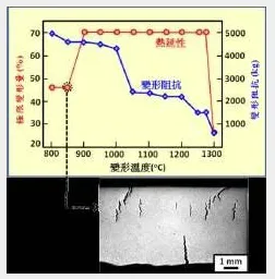 图11 镍基合金Inconel 601于不同温度下之热延 性与变形阻抗之数据曲线,显示于热延性低于60%之温度下行加工易造成裂缝的发生