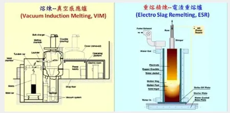 镍基合金之成分组成以Ni-Cr-Fe为主, 其它元素的添加如Cu、Si、Mn、Al、Ti、Nb、W、C等。一般从文献可了解这些元素对超合金材料的影响,但若要重组或添加新的合金成份,并了解其在微组织之交互作用, 近来已有以材料性质模拟软件,可进行合金系统热力学与动力学的计算,协助提供高性价比之方向,可提高合金设计的效率。而合金设计的实现则须由熔炼技术来完成,镍基合金熔炼主要区分为一般品级的电炉 (Electric Arc Furnace,EAF)+电渣重熔精炼 (Electro-Alag Remelting,EAR)及高品级的真空感应熔炼(Vacuum Induction Melting,VIM)+电渣重熔精炼产品。为了熔炼时获得更纯净化的合金钢液,减低气体含量与有害元素含量;同时由于部分合金中有易氧化元素如Al、Ti等存在,以非真空方式冶炼难以控制;更是为了获得更好的热塑性,镍基合金通常采用真空感应炉熔炼,甚至用真空感应熔炼加真空自耗炉或电渣炉重熔方式进行生产。其中VIM图10: