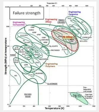 包含利用前述以离子与共价键结,在常温下具有高熔点、高强度之γ'或γ''等析出相,搭配滑移系统多而具延展性之沃斯田铁相基地,以复合材料之概念得到兼具强度塑性之优异机械性质,使得镍基合金的应用温度成为金属材料中最高的图4。