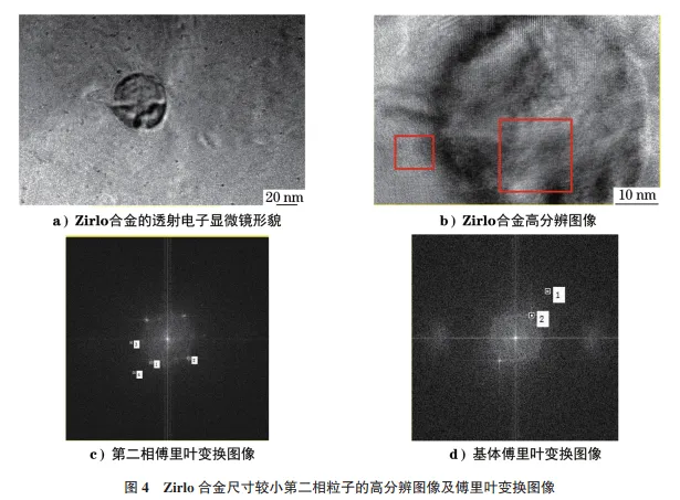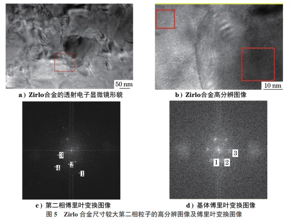 图3为Zirlo 合金透射电子显微镜形貌及第二相粒子能谱图。由图3可知:Zirlo合金中存在大小不同的两种第二相粒子,尺寸较大的第二相主要以Zr、Nb、Fe元素为主,尺寸较小的第二相主要以Zr、Nb元素为主。分别采集这两种不同的第二相粒子的高分辨图像,并对其进行傅里叶变换,结果如图4,5所示。图4为Zirlo合金尺寸较小的第二相粒子的高分辨图像及傅里叶变换图像,图5为Zirlo合金尺寸较大的第二相粒子的高分辨图像及傅里叶变换图像。