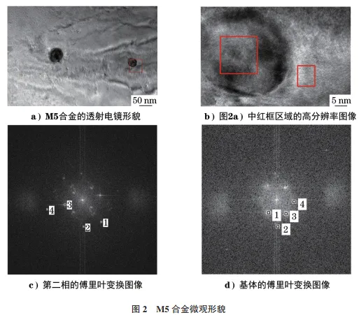 对M5合金试样中的4个第二相粒子进行能谱分析,试样编号分别为T-M5-1、T-M5-2、T-M5-3、T-M5-4,结果如表2所示。由表2可知:M5合金的化学成分主要为Zr元素和Nb元素。对基体和第二相分别进行高分辨图像的采集,结果如图2所示。