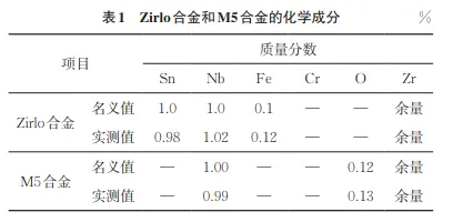 Zirlo合金和M5合金的名义和实测化学成分如表1所示。