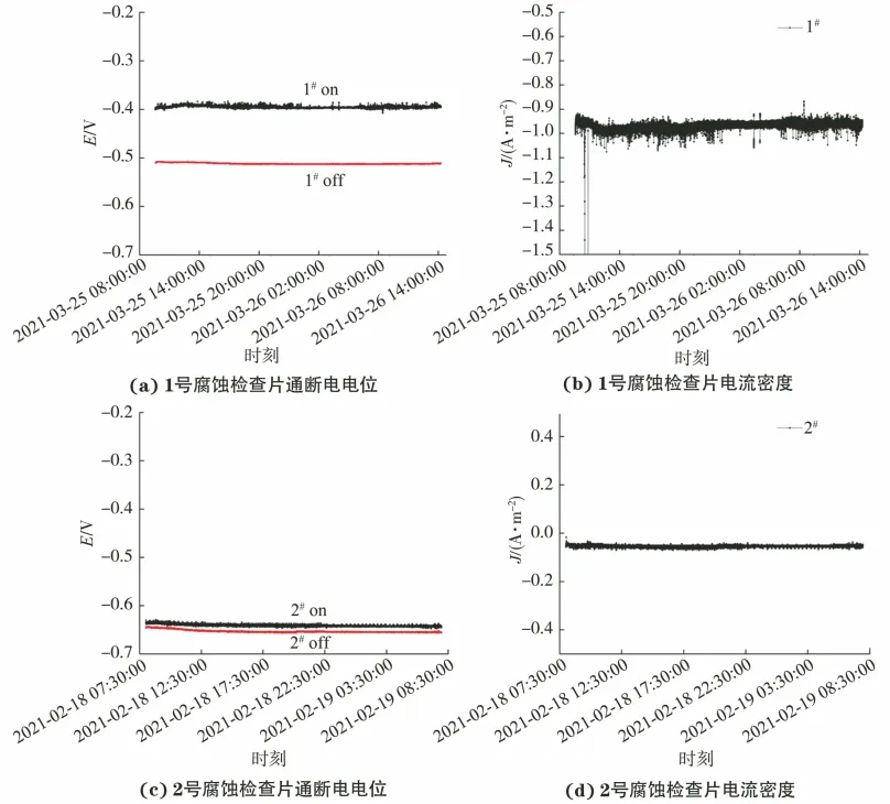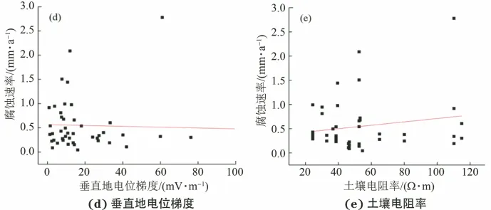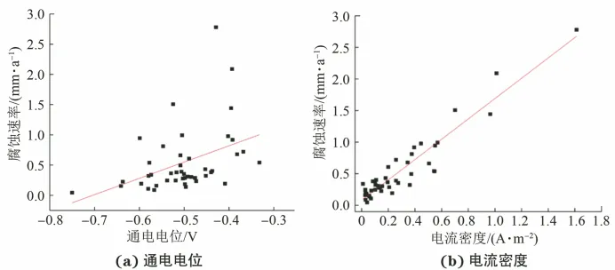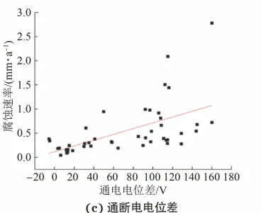 随着我国城市建设的不断发展,城市燃气事业迅速发展,地下管网规模也随之扩大。燃气管道的不断建设发展给人们的生活带来了极大的便利,然而燃气是一种危险性很高的能源,一旦燃气管道发生泄漏将危害人民的生命和财产安全。 腐蚀是管道泄漏的重要影响因素,随着埋地燃气管网服役时间的延长及地下服役环境的日益复杂,腐蚀风险加大,每年因腐蚀导致的泄漏事件越来越多,在各类抢修事件中占比超过40%。由于中、低压管道防腐蚀层大多采用石油沥青,且没有阴极保护,更容易发生腐蚀泄漏。如何对无阴极保护的中、低压燃气管道的腐蚀风险进行有效检测和准确评估,已成为实际生产的迫切需求。 国内外埋地管道腐蚀评判的相关标准大多针对有阴极保护的管道,关于无阴极保护管道的腐蚀评判标准较少,且几个涉及无阴极保护管道腐蚀评判的标准,仅对少量参数如土壤电阻率、地电位梯度(杂散电流)等进行了规定,缺少无阴极保护管道腐蚀风险综合评判的标准。此外,这些标准的腐蚀评判指标存在较大差异。虽然有部分标准对无阴极保护管道的腐蚀风险做出评判,但究竟哪些参量能够对无阴极保护埋地燃气管道的腐蚀风险进行评判目前缺乏认识和研究。 国内外学者针对管道腐蚀风险及完整性管理做了相关研究,欧美许多国家制定了完善的规范标准并开发了管道风险评估软件,也有学者运用机器学习的方法构建腐蚀风险评价模型。尽管有很多学者对管道的腐蚀风险进行预测,但是并没有基于现场腐蚀试验的数据。 为此,北京市燃气集团有限责任公司的技术人员通过对管道腐蚀泄漏数据及现场腐蚀检查片的相关情况进行分析,探究了无阴极保护埋地管道腐蚀速率的影响参量。 中、低压管网外腐蚀泄漏位置的管地电位分布情况 收集整理了某燃气公司在2016~2020年间,中、低压燃气管道腐蚀泄漏的情况,期间共发生639起腐蚀泄漏事件。 分析了泄漏位置的管地电位分布情况,统计发现在这639起事件中,管地电位正于-0.70 V(相对于铜/饱和硫酸铜参比电极,CSE)的占比95%,通电电位正于-0.60 V的占比93.3%,通电电位正于-0.55 V的占比86.1%,通电电位正于-0.50 V的占比72.3%。 总体来说,管地电位为-0.50~-0.45 V的占比最高(32.9%),-0.45~-0.40 V的占比20%。统计结果表明,管地电位与腐蚀泄漏有一定的相关性,管地电位越正说明该位置发生电流流出导致阳极极化的概率越大。 现场腐蚀检查片的情况 由于缺乏关于无阴极保护埋地燃气管道腐蚀风险评判的标准,为了找到适用于无阴极保护下燃气管道腐蚀危害的评判参量,开展了现场腐蚀检查片埋设试验。 在实际服役的无阴极保护埋地燃气管道现场埋设了腐蚀检查片,如图1所示,腐蚀检查片与埋地燃气管道材质相同,通过导线与燃气管道电连接,用于模拟燃气管道上的防腐蚀层破损点;利用腐蚀检查片测试腐蚀速率;在检查片与管道之间安装数据记录仪UDL-2,以测试检查片对地通电电位、直流电流密度及断电电位之差等参数。 图1 现场腐蚀检查片的测试示意 检查片的埋设应保证与埋地燃气管道处于同一深度,且尽可能处于相同的环境,但由于检查片材质比较新,而管道服役时间较长,在埋设初期,管道的自腐蚀电位约为-0.5 V,检查片的自腐蚀电位约为-0.7 V。 在埋设初期二者的自腐蚀电位存在电位差且表面状态不同,一段时间后,由于流出电流的作用,检查片表面发生腐蚀,二者的自腐蚀电位逐步趋于相同,此时二者表面状态近乎相同。 检查片的腐蚀包含由于管道与检查片的电偶作用产生的腐蚀,但当检查片的埋设时间超过6个月后,由管道与检查片的电偶作用产生的腐蚀可以忽略。 现场测试结果 腐蚀检查片在实际环境中埋设6个月后,对其直流电位和电流进行了24小时监测。如图2所示,无阴保埋地管道的电流及电位情况主要有两种。 图2 现场腐蚀检查片的电位、电流监测结果 第一种如1号检查片所示,通电电位正于断电电位,电流方向为流出,流出电流密度约为0.95 A/m2,电位和电流波动很小,此时管道受到稳态直流杂散电流的干扰严重。 第二种如2号检查片所示,通电电位与断电电位的差很小,电流密度接近0,管道中几乎没有杂散电流的干扰,此时管道处于自腐蚀状态。 开挖取出埋设约6个月的检查片,采用物理清理和化学清洗对其进行处理。物理清理主要是将检查片表面沉积的泥土和沙子清除。检查片在水中浸泡约10分钟,用毛刷清除表面土壤覆盖层,观察表面腐蚀产物颜色。 化学酸洗法是将拍照后的试样放入酸洗液(500 mL盐酸,3.5 g六次甲基四胺,加蒸馏水配制成1000 mL溶液)中酸洗,以清除表面腐蚀锈层,最后计算检查片的腐蚀速率。 各参数与腐蚀速率的相关性 根据现场测得的管道各项参数,分析其与检查片腐蚀速率的相关性,并用皮尔逊系数表征。 结果如图3所示,得到各参数与腐蚀速率的相关系数(皮尔逊系数)分别为:通电电位0.41,电流密度0.95,通断电电位差0.56,垂直地电位梯度0.06,土壤电阻率0.03。可见电流密度与腐蚀速率的相关性最好,皮尔逊系数为0.95。各项参数与检查片腐蚀速率的相关性由高到低依次为:电流密度、通断电电位差、通电电位、垂直地电位梯度、土壤电阻率。 图3 各参数与检查片腐蚀速率的相关性 对管道有腐蚀危害的参量 由以上相关性结果可见,电流密度与腐蚀速率的相关性更好,其次是通断电电位差,这说明用检查片的流出