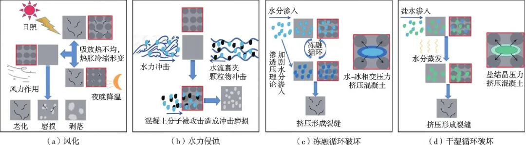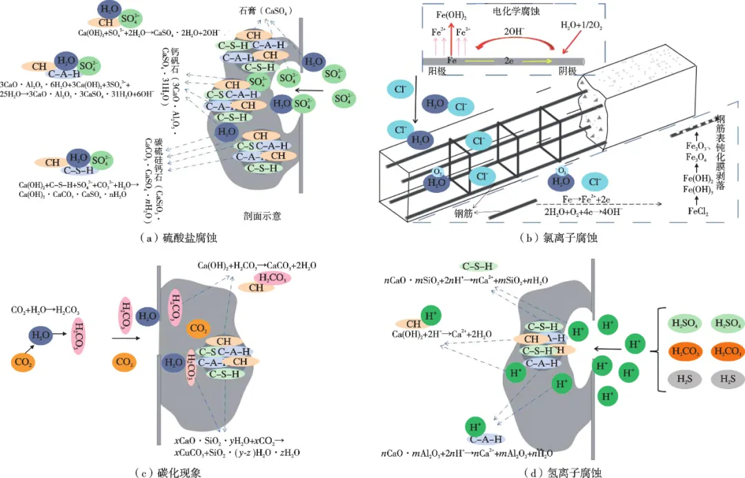 由于混凝土非均匀多孔的结构特性,其易被氯离子、硫酸盐、微生物等侵蚀而诱发结构破坏和承载力降低等现象。目前混凝土的腐蚀途径主要包括:物理腐蚀、化学腐蚀以及微生物腐蚀等。