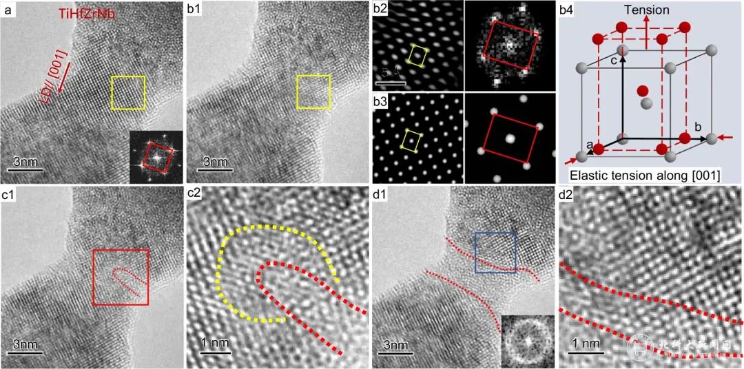 弹性稳定性是晶体固体对外部刺激的结构响应的基础,包括熔化、初期塑性和断裂。这项工作中,吕昭平课题组与浙江大学联合提出,利用原位力学测试和透射电子显微镜的原子分辨率表征,研究一系列高熵合金(HEAs)的弹性稳定性。在拉伸载荷作用下,当弹性应变达到~10%时,HEA晶格的有序性突然消失。这种弹性应变诱导的非晶化,与先前报道的位错介导的弹性不稳定和缺陷积累介导的非晶化形成对比。结合第一性原理计算和原子分辨率化学映射,发现弹性应变诱导的非晶化与HEAs的局部原子环境不均匀性导致的位错成核抑制密切相关。本项研究结果诠释了弹性不稳定性和初期塑性等物理力学现象的基本性质。