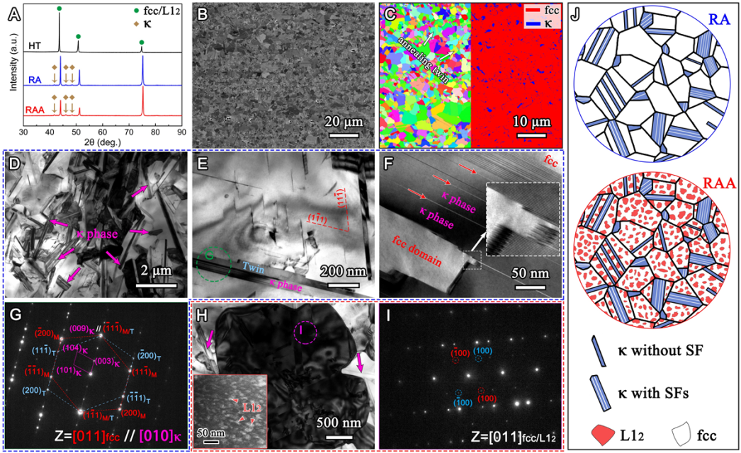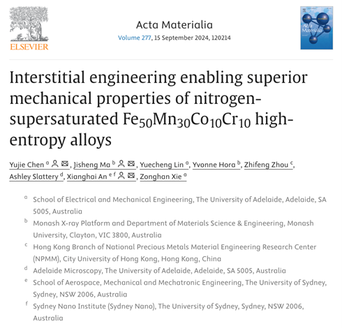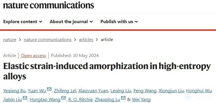 北京科技大学新金属材料国家重点实验室吕昭平、吴渊教授团队与北京高压科学研究中心曾桥石研究员合作,提出了一种新方法,通过高温高压手段,直接将铝基CCA中的多种脆性相转变为单相延性固溶体。成功开发出一种单相FCC结构的铝基CCA,Al55Mg35Li5Zn5,其密度低至2.40g/cm3(低于大多数铝合金 ~ 2.8g/cm3),比屈服强度达到344×103N·m/kg(目前铝基合金通常约为200×103N·m/kg)。分析表明,单相CCA的形成归因于高压下溶质元素与铝之间原子尺寸和电负性差异的减少,以及高温高压条件下的协同高熵效应。超高的强度来自于单一FCC晶格中多种元素导致的固溶强化,以及纳米级化学波动引起的位错钉扎效应。相关工作以 “Lightweight single-phase Al-based complex concentrated alloy with high specific strength”为题在线发表在《Nature Communications》上。论文第一作者为博士生韩明亮。澳大利亚阿德莱德大学谢宗翰和陈玉洁团队和悉尼大学安祥海团队成功研发了一种氮过饱和的高熵合金,该合金在机械性能方面表现出色。这项研究的核心是将含量高达28.9 at.% 的氮原子引入Fe50Mn30Co10Cr10高熵合金中,从而实现显著的固溶强化和相结构调整效果。尽管氮含量极高,这些合金仍保持固溶体相态,未形成氮化物。随着氮含量的增加,合金的微观结构经历了从单一面心立方(FCC)相到双相结构(FCC和六方密排(HCP)相),再回到主要为FCC相的转变。该合金表现出高达20 GPa的硬度,这一数值接近于陶瓷材料的硬度,但同时保持了优异的抗损伤性能和塑性变形能力。研究表明,这些卓越的机械性能归因于高氮含量带来的大规模固溶强化、层级双相结构以及应力诱导的FCC到HCP相变及孪生。与传统氮化物的脆性不同,这些氮过饱和高熵合金展现出类似于金属材料的显著塑性变形能力,为提升合金的机械性能开辟了新的途径。本研究成果以“Interstitial Engineering Enabling Superior Mechanical Properties of Nitrogen-Supersaturated Fe50Mn30Co10Cr10 High-Entropy Alloys“ 为题发表在国际著名期刊《Acta Materialia》上。论文第一作者为澳大利亚阿德莱德大学的陈玉洁博士,通讯作者为Jisheng Ma博士(莫纳什大学)和安祥海博士(悉尼大学)。其他作者还包括林悦铖博士生(阿德莱德大学)、Yvonne Hora(莫纳什大学)、Ashley Slattery博士(阿德莱德大学)、周志烽博士(香港城市大学)和谢宗翰教授(阿德莱德大学)。北京科技大学新金属材料国家重点实验室合金设计与模拟梯队吕昭平、吴渊教授团队与浙江大学合作者王宏涛、刘嘉斌教授等在《Nature Communications》上发表题为“Elastic strain-induced amorphization in high-entropy alloys”的文章。
