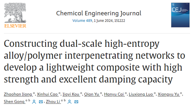 南京理工大学材料学院纳米异构材料中心团队在高强韧多主元中熵合金设计研究方向取得新进展,在《Science Advances》上发表了题为《Ultrastrong and ductile medium-entropy alloys via hierarchical ordering》的研究论文。纳米异构材料中心团队研究人员提出分级有序相强韧化新理念,通过分级有序化在单相面心立方结构Ni2CoFeV中熵合金中逐步引入三方晶体结构的κ有序相和立方结构的L12有序相来同时实现超高强度和优异塑性。添加过量Ni元素主要目的:一是稳定基体面心立方相,二是增加合金整体的价电子浓度,从而增强中温下κ相析出的驱动力。由于Ni-V,Co-V原子对之间具有较负的混合焓,导致Co,Ni,V原子之间存在较强的相互作用,从而形成了由不同成分组成的分级有序相弥散分布在无序fcc基体中(图1),最终使合金具有GPa级屈服强度和超过1.6 GPa的抗拉强度,同时在室温下保持了30%的优异塑性(图2)。微观结构表征揭示了在三相Ni2CoFeV中熵合金内同时激活多种变形机制,增强变形过程中的加工硬化能力,延迟拉伸颈缩失稳,从而获得优异的塑性。中南大学材料科学与工程学院李周教授和龚深教授等人提出了一种双尺度互穿网络设计策略,开发出双尺度CrMnFeCoNi/聚合物互穿相复合材料(IPCs)。在宏观尺度下,以具有热弹性马氏体相变和连通孔隙的Cr20Mn20Fe20Co35Ni5(at.%)高熵形状记忆合金(HESMA)泡沫为骨架,将负载CrMnFeCoNi纳米合金的碳纳米管(CrMnFeCoNi@CNTs)与聚氨酯/环氧树脂互穿聚合物网络(PU/EP IPN)组成的复合体渗入到连通孔隙中,形成HESMA泡沫/聚合物互穿网络结构。该结构既能有效减轻阻尼合金的重量,又能弥补聚合物强度低和尺寸稳定性差的缺点,还在互穿相之间形成了高密度的界面。此外,HESMA和聚合物的结构完整性和连续性允许它们发挥各自的阻尼机制,通过叠加多重阻尼实现宽频域和宽温域内的高阻尼能力。在微观尺度下,形成高熵纳米合金/CNT/聚合物互穿网络结构能大幅增加聚合物内界面,提高其刚度和强度,拓宽其阻尼温域,还能在聚合物中形成连通的导热网络提高热能耗散能力。