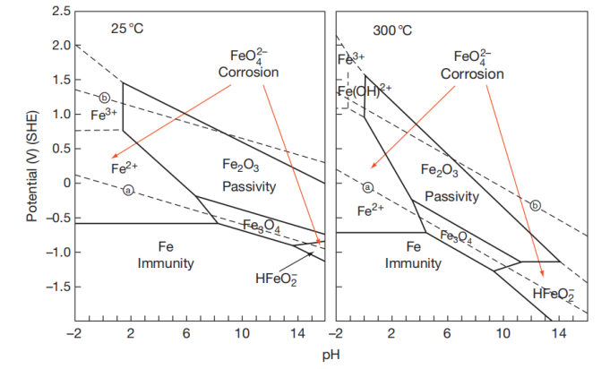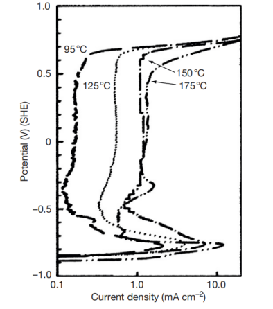 碱脆的机理存在是晶界铁素体优先阳极溶解还是晶间碳化物优先溶解等争议,人们在解释其开裂机理时用经典SCC理论来解释碱性环境下发生开裂的现象。(1)较高浓度的碱液:如在常压沸点温度下,低碳钢发生碱脆时的NaOH质量分数须大于5%。(2)较高的温度:碱脆的温度范围较宽,碳钢的碱应力腐蚀一般发生在50~80℃以上,与碱的浓度有关,60℃左右为产生碱脆的最低临界温度,但最容易引起碱脆的温度是在溶液的沸点附近。(3)较高的拉伸应力:有理论认为低碳钢在热浓碱溶液中SCC机理属于沿晶阳极溶解型,SCC电位位于活化-钝化转变的范围内。碱脆的物理模型见下图。 图 低碳钢在80℃、NaOH35%wt溶液中阳极极化曲线及断裂电位区腐蚀反应可能为,当局部NaOH质量分数大于10%时,金属的保护性氧化膜将被溶解,露出的基体金属进一步与碱反应,反应式为:所形成的腐蚀产物为疏松、多孔的磁性氧化物,形貌为非层状结构,其水溶液呈现碱性。在锅炉或热交换器的水中只要含有 (10~20) mg/L的NaOH,局部反复蒸发浓缩可以导致在沉积物下或缝隙中碱的浓缩,引起局部碱腐蚀;在碱腐蚀和拉应力同时存在的条件下,可以引起碱脆。有理论认为,腐蚀产生的部分H离子扩散入金属内部,引起氢脆。所以,碱脆可以是氢致开裂型,也可以是阳极溶解型,或混合型开裂。碱脆裂纹一般呈现沿晶特征,有分叉。但也可能出现穿晶开裂的情况,如在质量分数为50%的 NaOH溶液中,奥氏体不锈钢开裂形态与热处理无关,都是穿晶开裂。碱脆容易发生在残余应力比较高的含碱液体浓缩部位,如焊接接头部位。发生这种SCC时,通常主要是沿晶间发展,并且裂缝里充填有氧化物,破裂表面已经变脆。裂纹多平行于焊缝。碳钢碱脆裂纹金相显示为细小带有氧化物的网状沿晶裂纹。有3个主要参数决定碱脆敏感性:碱液浓度、金属温度、拉伸应力大小。工业经验表明,有些碱脆发生在几天内,而更多的需要1年以上的暴露时间,增加碱液浓度和温度可以提高开裂速度。碱脆必须有高温浓碱液的腐蚀,如当NaOH 的质量分数低于5%则不发生碱脆,这些浓碱液可以是设备的工作介质,也可以是设备在使用过程富集的,苛性碱的浓度愈高,则碱脆敏感性愈大。碱脆不仅与碱的浓度有关,还取决于溶液的温度,见下图: 图 NaOH浓度和温度对碳钢SCC断裂敏感性影响(1-实验值;2-82个工厂现场调查结果)上图显示出这两个因素的综合效应,低于图中的 AB 线或曲线2 ,则不发生碱脆。碱脆断裂时间的对数与溶液绝对温度的倒数呈线性关系,表明这种溶解-断裂过程是一种热激活过程,温度升高,发生碱脆破裂的时间缩短。下图为金属碱脆敏感性临界参数曲线,碳钢在温度低46℃的环境不会发生碱脆。在温度高于82℃,NaOH质量分数大于5%时,有很高的开裂敏感性。关于温度的影响,需要考虑的是金属接触碱液的实际温度,而不仅仅是正常的工艺温度,有许多常温输送碱液管道,在安装有蒸汽伴热的情况下,发生过碱脆。图 碳钢碱脆敏感性临界参数曲线(来源:NACE Caustic soda service chart )低碳钢的碱脆断裂时间随着应力的降低而增加。在实践中发现残余塑性变形最大的热影响区部分的金属,即焊接过程中被加热到500~850℃的那部分金属其 SCC的倾向性最大。在碱液生产和储运使用的设备检修中发现,在焊接过程中加热温度超过550℃ 和略低于再结晶区的金属,在碱性溶液中具有最大的开裂倾向。这些正是焊接残余应力和组织应力最大的部位。由于低碳钢的碱脆和硝脆是沿晶断裂的, 所以,有理论认为这种脆断的敏感性是由于C、N 等元素在晶界偏析引起的,由此观点出发,低碳钢碱脆的金属学因素有:(2)微量元素的作用:由于S、 P、As等杂质在晶界偏析,增加了碱脆敏感性;而少量La、Al、 Ti、V等可能是由于降低了有害杂质在晶界区偏析,从而降低了碱脆敏感性;(4)热处理:球化处理后钢的碱脆敏感性大于正火状态,这可能是球化碳化物的同时增加了晶界偏析的结果;(5)合金成分:奥氏体不锈钢中铬镍合金元素含量对于抗SCC性能有很大影响,铬镍含量低的不锈钢容易发生碱脆,高镍合金 (如Inconel等合金)的抗碱脆性能要比奥氏体不锈钢好得多。 图 纯Fe、Ni、Cr、Mo在90℃,15%wt NaOH中的动电位极化曲线低碳钢在沸腾的质量分数为35%~40% NaOH溶液中碱脆的敏感电位范围为(-1150~800)mV (SCE),在沸点 (120℃)下钢的碱脆发生在-700mV (SCE)左右的很窄电位范围内,如下图所示。 图 在NaOH溶液中碳钢产生的临界电位随温度变化的情况在临界电位下,试样的断面收缩率大大下降,如下图所示。X射线结构分析表明在试样表面形成了四氧化三铁保护膜。图 在沸腾溶液中,在临界电位范围内碳钢的断面收缩率的变化 图 AISI1020碳钢在(95~175)℃的动电位极化曲线(2.75M-NaOH溶液,浓度~11%w/w)▪碱液浓度:确定该设备或管道中最高的碱液浓度,尤其是要考虑清楚是否存在反复浓缩的部位,当存在反复浓缩情况时,碱液浓度没有下限。▪温度:确定该设备中最高的工艺温度和金属壁温,同时还需要考虑碱液混合时因放热导致的局部升温。▪伴热:确定该设备或管道是否有蒸汽伴热或电伴热,是否会导致伴热部位局部蒸发浓缩。▪蒸汽吹扫:确定该设备中残余碱液在水洗之前是否存在蒸汽冲扫时局部加热浓缩的情况。▪消除应力:确定该设备或管道是否在焊接或冷加工后采取了合适的消应力处理。碱腐蚀开裂敏感性具体判断步骤可参