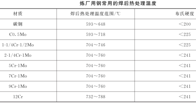碳钢和低合金钢焊后去应力退火温度不低于620℃ ,并按照 1h/25mm (厚度)计算保温时间。下表是炼厂用钢常用的焊后热处理温度范围,硬度值可以作为热处理效果的判据。