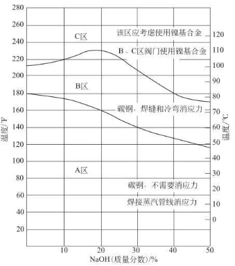主要管线和设备更换不锈钢304材质,提高碱脆的温度破裂区域温度。根据下图可以看出304不锈钢的碱脆破裂温度超过120°C。