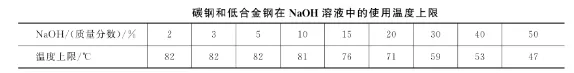 在环境温度下,可以设计选用碳钢设备装载苛性碱,从强度、塑性和碱脆敏感性3方面综合考虑,在最高温度46℃的苛性碱溶液的环境中,也能够选用碳钢,C质量分数约为0.20%的镇静钢 (20g)是最合适的碳钢。