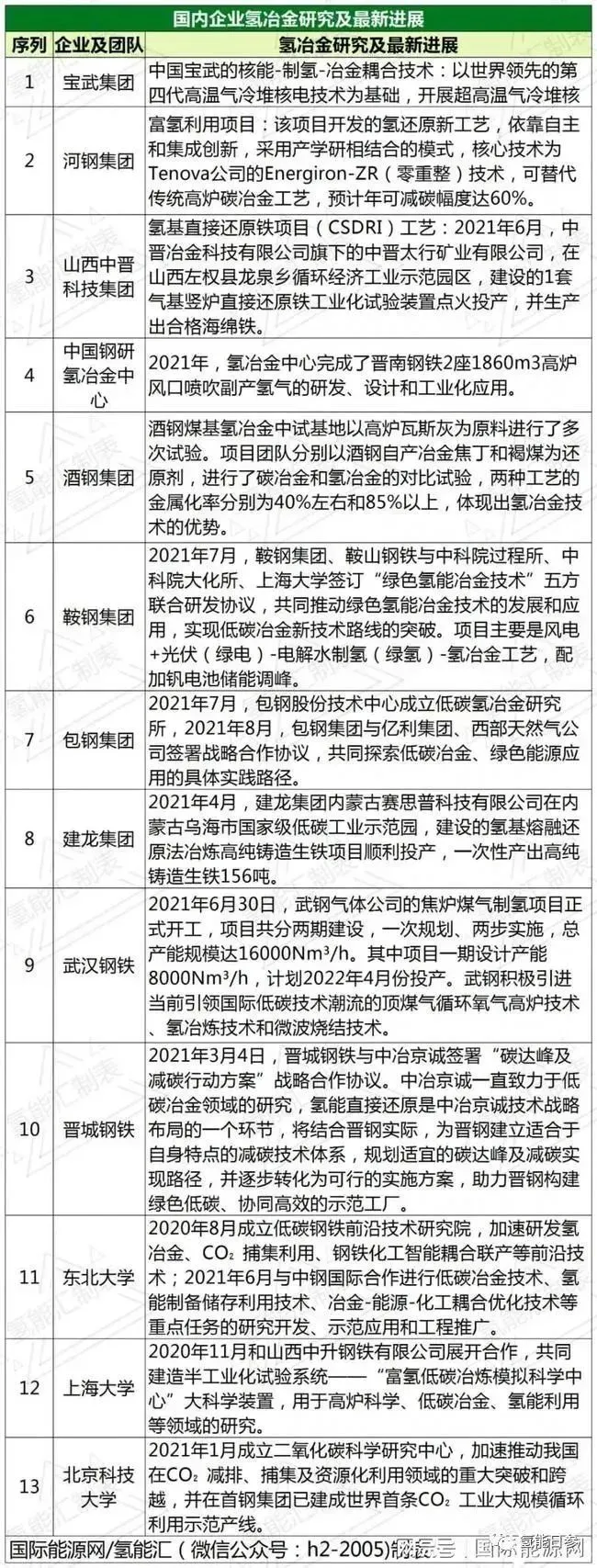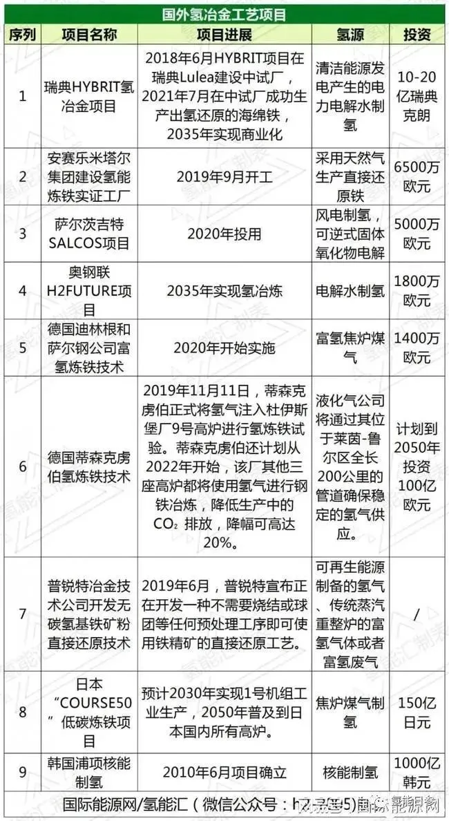 02 气基直接还原竖炉 即通过使用氢气与一氧化碳混合气体作为还原剂,将铁矿石转化为直接还原铁,再将其投入电炉进行进一步冶炼。氢气作为还原剂的加入使碳排放得到了有效控制。相较于富氢还原高炉,每吨二氧化碳排放量可减少50%以上。这种方式更适合用于氢冶金。 高炉富氢减碳幅度为10%-20%,效果有限。气基直接还原竖炉工艺是直接还原技术,不需要炼焦、烧结、炼铁等环节,能够从源头控制碳排放,相较于高炉富氢还原减碳幅度可达50%以上,减排潜力较大,是迅速扩大直接还原铁生产的有效途径。但气基竖炉存在吸热效应强、入炉H2气量增大、生产成本升高、H2还原速率下降、产品活性高和难以钝化运输等诸多问题。无论是高炉炼铁还是气基竖炉直接还原铁,采用氢冶金方式均具备明显的减碳作用。 多国发布氢冶金技术路线图 近年来,全球钢铁行业都在积极开展氢能冶金实践。欧洲、日本、韩国等国家和地区的钢铁企业均制定了包括氢能冶金在内的低碳冶金技术路线图,加快研发、试验和应用,为实现碳中和目标寻求工艺技术突破。 目前全球已经有部分氢冶金技术的案例,例如瑞典酐铁HYBRIT项目、萨尔茨吉特SALCOS项目、奥钢联H2Future项目、德国蒂森克虏伯Carbon2Chem项目等。
