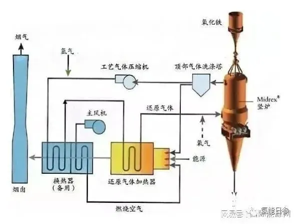 2019年,电力、钢铁、水泥和煤化工行业合计煤耗占比超过86%,四个行业二氧化碳排放约77.6亿吨,占全国二氧化碳排放总量的72%。随着“碳达峰、碳中和”成为全球产业发展的主旋律,碳排放排名第二的钢铁行业需要进行深度变革。 氢冶金因其巨大的减排潜力,已成为龙头钢企志在必得的制高点,国内外多家钢铁公司正在大力布局氢能冶金、绿氢制备和氢能供应等项目。从“碳冶金”到“氢冶金”,钢铁工业有望摘掉高碳排放、高污染、高能耗的帽子。 以氢代碳的还原反应 氢冶金即用氢气取代碳作为还原剂和能量源炼铁,还原产物为水,可实现零碳排放(基本反应式为Fe2O3+3H2=2Fe+3H2O,还原剂为氢气,产物为铁和水)。 氢冶金的原理 目前主流的氢冶金技术路线为高炉富氢冶炼与气基直接还原竖炉炼铁两种: