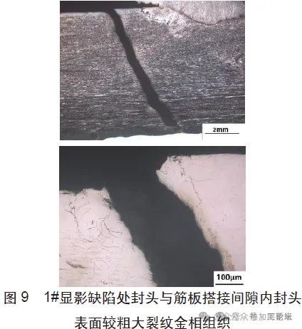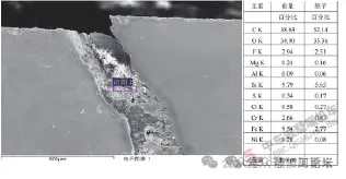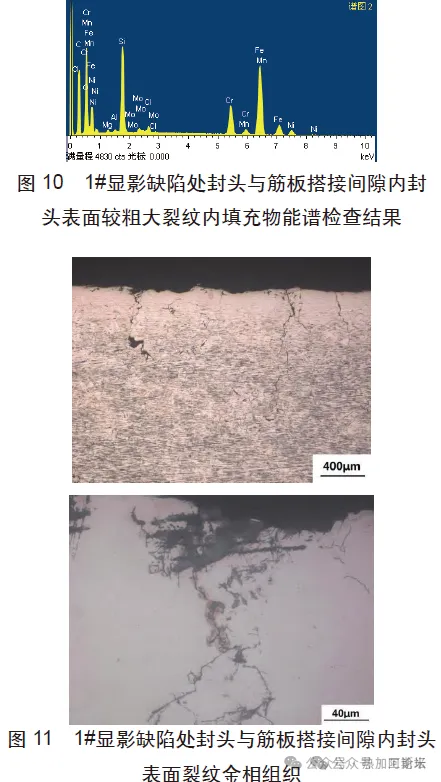 摘 要:某批次规格为EHA400*12的S30403封头在投入使用两年后,封头底部发生开裂泄露,为查明其开裂原因,对其宏观形貌、化学成分、力学性能、耐腐蚀性能、金相、腐蚀产物进行分析。结果表明:该S30403封头内壁筋板根部一侧焊缝局部焊趾处存在未熔合缺陷,HCl等富Clˉ的工作介质易由未熔合缺陷进入并沉积在搭接间隙内腔,在服役压力、焊接残余应力和加工应力的共同作用下,导致焊接薄弱处和封头表面应力腐蚀开裂。公司生产的某批次共计6 只规格为EHA400*12的S30403封头在交付客户使用两年后,其中2只封头在服役过程中发生开裂泄露。该批次封头生产工艺如下:钢板切圆-680T冷冲压成型-坡口-研磨-酸洗-交付。客户对泄露的封头进行渗透探伤确定泄漏位置后,将泄漏位置外壁进行打磨和补焊处理(如图1a所示),补焊所用焊丝熔敷金属材质为E308L-16。由设备铭牌可知(如图1b所示),封头内工作介质中存在HCl等富Clˉ的化合物。 为查明其开裂原因,对其中1只开裂封头进行宏观形貌、化学成分、机械性能、耐腐蚀性能、断口形貌、金相组织进行检测及分析。2.1 宏观形貌 图2为封头内、外壁表面宏观照片,封头内壁中间存在一块筋板,筋板根部与封头内壁通过两侧的角焊缝连接,封头内壁存在大量红褐色锈蚀产物,观察发现,封头外壁补焊焊缝恰位于筋板根部与封头的角焊缝处。对该封头进行探伤检查,以确认其内壁表面开裂泄漏位置,图3为开裂封头内、外壁表面以及封头内壁筋板根部两侧角焊缝区域渗透探伤照片,封头外壁表面未见渗透探伤显影缺陷,封头内壁筋板根部两侧角焊缝中A焊缝在焊缝与筋板的焊趾处存在两处较明显的渗透探伤显影缺陷,且其中一处显影缺陷(1#显影缺陷)恰位于补焊位置,B焊缝显影缺陷不明显。2.2 化学成分检测 对封头、筋板和角焊缝基体取样进行化学成分检查,结果见表1,封头和筋板基体化学成分均符合GB/T 24511—2017中S30403技术规范,角焊缝基体化学成分符合角焊缝焊丝熔敷金属技术规范。2.3 力学性能检测 对封头基体取样进行常温力学性能测试,结果见表2,其强度明显高于、断后伸长率则低于GB/T 24511—2017中经固溶处理的S30403技术规范,这应与其成型加工过程中的冷作硬化作用有关。2.4 封头基体耐腐蚀性试验 参照GB/T 4334—2020中E法对送检封头基体进行晶间腐蚀试验,试验后试样表面均无晶间腐蚀裂纹,如图4所示。2.5 金相检查2.5.1 封头和筋板常规金相检查 切取封头和筋板基体试样进行金相检查,根据GB/T 10561—2022评定封头基体非金属夹杂物级别为:BT1.0,DT1.0,筋板基体非金属夹杂物级别为:CT1.5,DT1.0。图5为封头和筋板基体金相组织照片,其组织均为奥氏体+5%条状铁素体,晶粒度为7级。2.5.2 封头1#显影缺陷截面金相检查 切取1#显影缺陷截面试样进行金相检查,图6为封头1#显影缺陷截面宏观形貌,1#显影缺陷为A焊缝焊趾与筋板完全分离形成的缝隙缺陷,缝隙缺陷内存在较多填充物,筋板与封头之间还存在较大搭接间隙,缝隙缺陷与搭接间隙相连通,1#显影缺陷附近筋板表面、焊缝根部以及搭接间隙内封头表面还存在多条曲折分叉裂纹,裂纹均集中于焊缝附近,搭接间隙内封头表面的其中一条较粗大裂纹延伸至补焊焊缝,较粗大裂纹应是贯穿至外壁的泄漏裂纹。由此推测,1#显影缺陷处A焊缝焊趾与筋板之间的缝隙缺陷和筋板与封头之间的搭接间隙内封头表面的较粗大裂纹相连通导致封头发生泄漏。 图7为封头1#显影缺陷缝隙内填充物能谱检查结果,其主要由O、Si元素组成,腐蚀性介质元素Cl含量也较高,这与其工作介质中元素组成相符。图8为封头1#显影缺陷截面金相组织,1#显影缝隙缺陷开口较大,缺陷处筋板表面几乎与筋板母材表面平行,且其表面组织为奥氏体,与母材组织基本一致,焊缝侧表面组织为奥氏体+条状和枝晶状铁素体,为典型的奥氏体不锈钢焊缝组织,焊缝侧表面还存在较多絮状小裂纹,这与其工作介质中存在腐蚀性介质元素Cl有关,1#显影缝隙缺陷具有焊接未熔合缺陷特征。 图9为1#显影缺陷处封头与筋板搭接间隙内封头表面较粗大裂纹金相组织,较粗大裂纹两侧存在或沿晶或穿晶的分叉裂纹。图10为1#显影缺陷处封头与筋板搭接间隙内封头表面较粗大裂纹内填充物能谱检查结果,填充物中O、F、S、Cl腐蚀性介质元素含量较高,较粗大裂纹符合应力腐蚀裂纹特征。图11为1#显影缺陷处封头与筋板搭接间隙内封头表面裂纹金相组织,封头与筋板搭接间隙内封头表面还存在多条起源于内壁表面的或沿晶或穿晶的分叉裂纹,均符合应力腐蚀裂纹特征。3.1 经宏观形貌检查,封头内壁中间筋板根部与封头内壁通过两侧的角焊缝连接,封头内壁存在大量红褐色锈蚀产物,封头外壁泄露处补焊焊缝恰位于筋板根部与封头的角焊缝处。经探伤检查,封头外壁表面未见渗透探伤显影缺陷,封头内壁筋板根部两侧角焊缝中A焊缝在焊缝与筋板的焊趾处(补焊位置)存在较明显的渗透探伤显影缺陷,将其标识为1#显影缺陷。3.2 经化学成分检测,封头和筋板基体化学成分均符合GB/T 24511—2017中S30403技术规范,角焊缝基体化学成分符合焊丝熔敷金属技术规范。3.3 经力学性能检测,送检封头基体强度明显高于、断后伸长率则低于GB/T 24511—2017中经固溶处理的S30403技术规范,这应与其成型加工过程中的冷作硬化作用有关。3.4 经耐腐蚀性试验,送检封头基体参照GB/T 4334—2020中E法进行