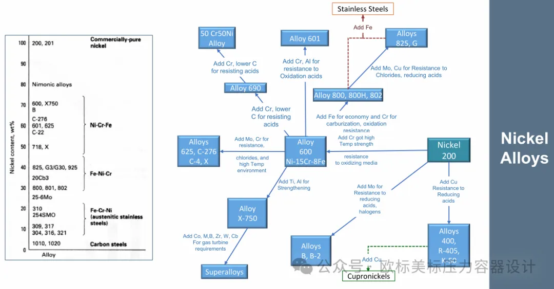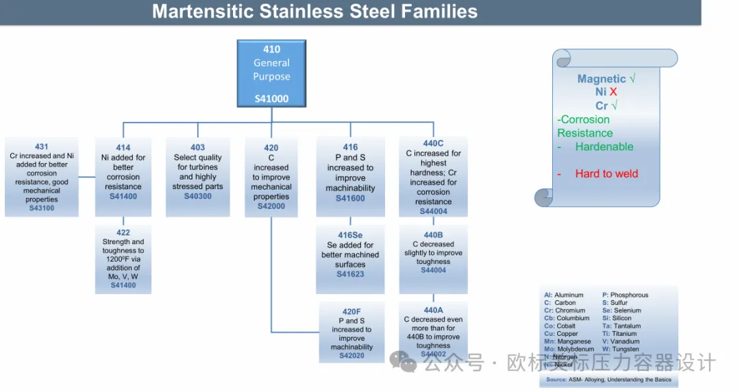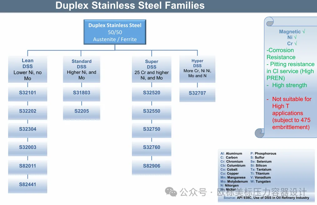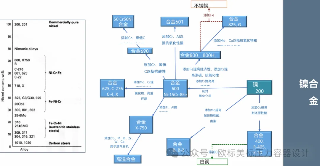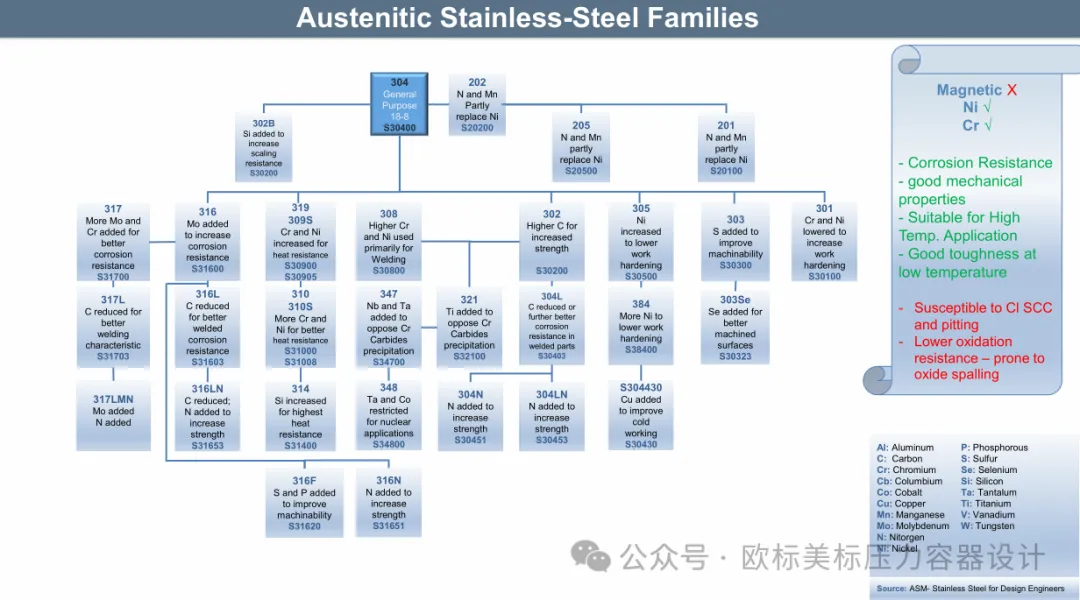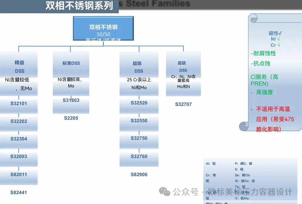 今天简单写写,前二天焊接的群主分享了一份印度焊接协会2021年石油和天然气工业网络研讨会的提纲资料,钟哥又在此基础上提供了中文翻译版。简单看了一下资料挺不错的,今天就先分享一下资料中关于奥氏体不锈钢,马氏体不锈钢,铁素体不锈钢,双相钢及镍基合金的“族谱”。
