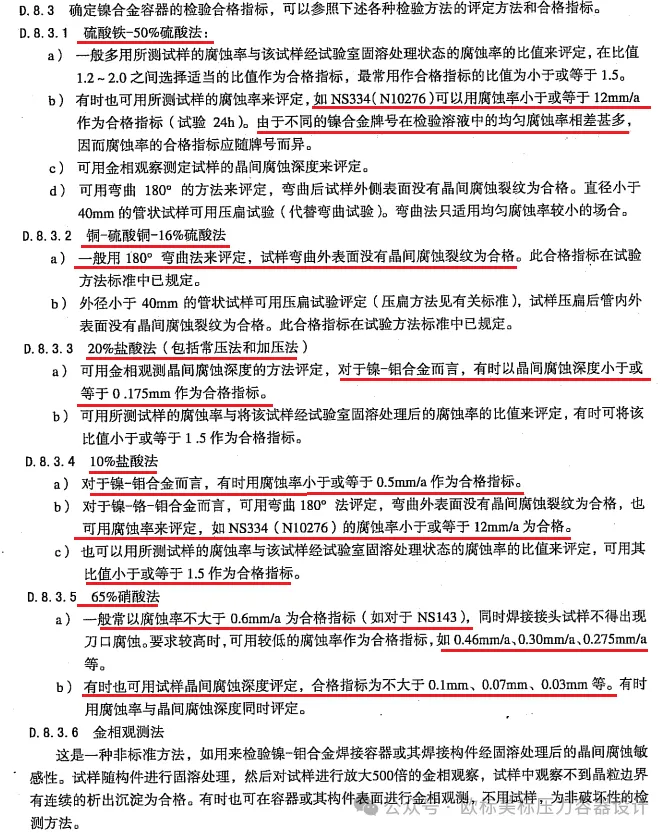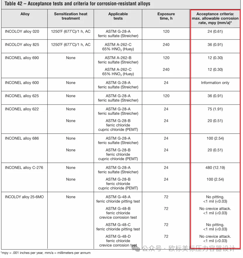 在国内的GB 15260-2016和GB 4334-2020等标准以及美国的ASTM A262和ASTM G28中涉及材料用腐蚀速率判定是否合格的。腐蚀试验的标准中几乎都只有试验方法,试验步骤,腐蚀速率的具体合格指标都是双方协商!在容器相关标准中也只有很少的几种材料的腐蚀速率建议值或者其它方法的的合格指标,如JB 4756-2006《镍及镍合金制压力容器》中规定C276材料的12mm/年(具体见文章结尾处的图片)。