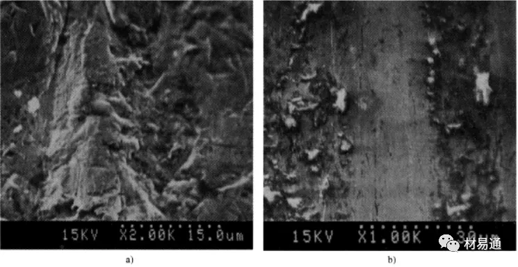 金属磨损是机械工程和材料科学中的一个重要研究领域。金属磨损是指金属表面在摩擦或接触过程中,由于机械或化学作用导致材料逐渐丧失的现象。磨损是影响金属材料使用寿命和性能的关键因素之一。了解磨损的基础知识对于材料选择、设计和维护非常重要。本期内容主要是分享金属磨损的基础知识和影响因素,学习适当的控制措施提高金属部件的使用寿命和性能。 金属磨损概述 金属摩擦表面相互接触过程中,表面不断发生损耗或产生塑性变形,使金属表面状态和尺寸发生改变的现象称为磨损。磨损导致的材料损失可能以磨屑、碎片或颗粒的形式表现出来。在摩擦载荷作用下,金属表面性质(金相组织、物理化学性能、力学性能)和形状的(形貌和尺寸、粗糙度、表面层厚度)会发生变化。 通常磨损过程是一个渐进的过程,正常情况下磨损直接的结果也并非灾难性的。金属磨损研究在材料科学与工程、机械工程和表面工程等领域均有涉及,各个学科的交叉和合作在磨损研究中也显得尤为重要,有助于全面理解和解决磨损问题。但从材料学科特别是从材料的工程应用来看,人们更重视研究材料的磨损。 图1 磨损行为的学科交叉性 金属磨损并非单一的力学过程。引起磨损的原因既有力学作用,也有物理和化学作用,因此,摩擦副材料、润滑条件、加载方式和大小、相对运动特性(方式和速度)以及工作温度等诸多因素均影响磨损量的大小,所以,磨损是一个复杂的系统过程。 磨损是材料五类失效模式之一,造成的损失也 是巨大的。据统计,在失效的零部件中,80%以上 是由各种形式的磨损或腐蚀引起的。就一个国家而言,每年因摩擦磨损造成的经济损失一般占GDP的1%以上。 在机械的正常运转中,磨损过程大致可分为三个阶段,如图2所示。 图2 金属磨损特性曲线 (1)跑合(磨合)磨损阶段 特点:这一阶段中,磨损速度由快变慢,而后逐渐减小到一稳定值。这是由于新加工的零件表面呈尖峰状态,使运转初期部件的实际接触面积较小,单位接触面积上的压力较大,因而磨损速度较快,如图1中磨损曲线的Oa段。跑合磨损到一定程度后,尖峰逐渐被磨平,磨损速度即逐渐减慢。 (2)稳定磨损阶段 特点:在这一阶段中磨损缓慢、磨损率稳定,零件以平稳而缓慢的磨损速度进入零件正常工作阶段,如图2中的ab段。这个阶段的长短即代表零件使用寿命的长短,磨损曲线的斜率即为磨损率,斜率越小磨损率就越低,零件的使用寿命就越长。经此磨损阶段后零件进入剧烈磨损阶段。 机制: 磨粒磨损:硬质颗粒或突起在表面滑动或滚动,产生划痕和切削作用。 腐蚀磨损:环境中的化学或电化学反应导致金属表面生成腐蚀产物,这些产物在机械作用下被移除。 疲劳磨损:由于循环应力作用,表面或亚表面材料产生疲劳裂纹,导致材料剥落。 (3)剧烈磨损阶段 特点:此阶段的特征是磨损速度及磨损率都急剧增大。当工作表面的总磨损量超过机械正常运转要求的某一允许值后,零件的磨损加剧,精度下降,润滑状态恶化,温度升高,从而产生振动、冲击和噪声,导致零件迅速失效,如图2中的bc段。 机制: 疲劳裂纹扩展:由于累积的疲劳损伤,裂纹继续扩展并最终导致材料剥落。 磨损产物的堆积:磨损产生的颗粒堆积在接触表面,增加磨粒磨损和粘着磨损的程度。 表面温度升高:摩擦热积累导致表面温度升高,材料软化和氧化加剧,加速磨损。 上述磨损过程中的三个阶段,是一般机械设备运转过程中都存在的。必须说明的是,在跑合阶段结束后应清洗零件,更换润滑油,这样才能正常地进入稳定磨损阶段。 耐磨性是材料抵抗外部磨损的性能,这是一个系统性质。迄今为止,还没有一个统一的、意义明确的耐磨性指标,表征金属的耐磨性需要综合使用各种磨损测试方法和分析技术,包括磨损试验、磨损量测量和表面分析等。 (1)磨损测试方法 可通过磨损试验机、磨粒磨损试验、腐蚀磨损试验等评估材料的耐磨性能。 (2)磨损量 在规定条件下,经过规定时间的磨损后,样品表面的损耗程度称为磨损量(W)。磨损量可通过测量长度、体积或质量的变化而得到,并相应称它们为线磨损量、体积磨损量和质量磨损量。 若测量单位摩擦距离、单位压力下的磨损量等,则称为比磨损量。磨损量越小,耐磨性越高。 (3)耐磨性 磨损量的倒数称为耐磨性,即ε=1/W。ε值越大,材料的磨损抗力越大。 (4)相对耐磨性 指在同样条件下,标准试样(Pb-Sn合金)的磨损量与被测试样磨损量的比值称为相对耐磨性。相对耐磨性的倒数称为磨损系数。 (5)磨损表面分析 可选择光学显微镜、扫描电子显微镜、能谱分析、X射线衍射等仪器设备了解磨损过程中材料的变化和机理。 ASTM G99:销-盘磨损试验标准。 ASTM G65:干砂橡胶轮磨损试验标准。 ASTM D4172:四球磨损试验标准。 ISO 20808:陶瓷材料的球-盘磨损试验标准。 金属的磨损类型 通常,按照磨损机理和磨损系统中材料与磨料、材料与材料之间的作用方式划分,磨损的主要类型可分为磨料磨损、粘着磨损、腐蚀磨损和疲劳磨损(接触疲劳)四种基本类型。但磨损过程十分复杂,有许多实际表现出来的磨损现象不能简单地归为某一种基本磨损类型,而往往是基本类型的复合或派生,如气蚀磨损、冲蚀磨损和微动磨损等。 一、粘着磨损 粘着磨损是指当两个金属表面在相对运动时,由于局部接触区域的粘着作用,导致