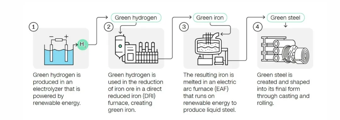 通过可再生能源电解制备绿氢; 使用绿氢对铁矿石直接还原获得铁; 使用可再生能源为动力源,在电弧炉内炼钢; 通过锻造、轧制等工艺得到最终的绿色钢铁。