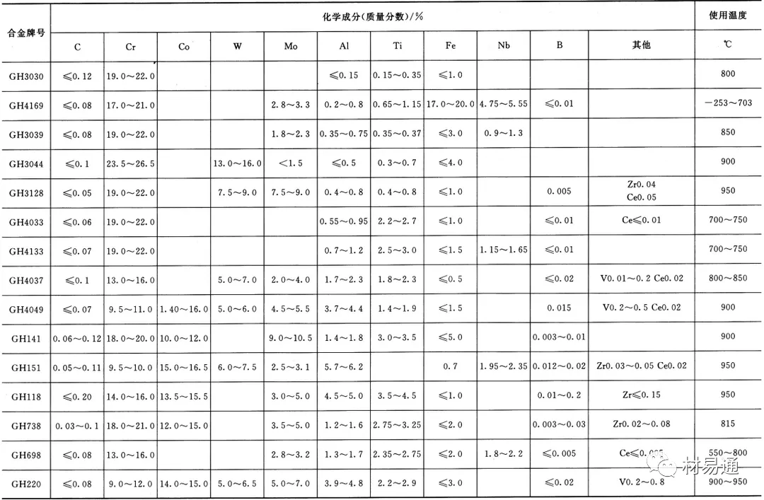 中国常用镍基变形高温合金的牌号、化学成分及使用温度