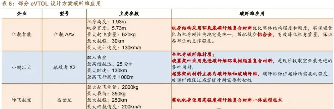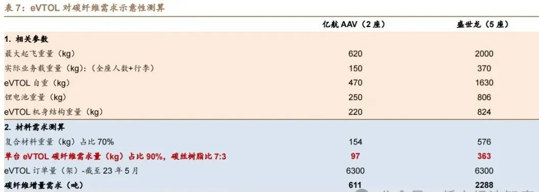 复合材料因其轻质、高强、耐蚀和可塑性等优点,成为制造低空航空器的理想材料。在这个追求效率、续航和环保的低空经济时代,复合材料的使用不仅影响着航空器的性能和安全,也是推动整个行业发展的关键。从碳纤维增强的无人机机翼到玻璃纤维制成的轻质结构,复合材料的创新不断为低空经济的增长提供动力。低空经济与复合材料的紧密联系在技术进步和产业升级中得到体现。随着全球对低空领域的政策逐渐放宽,以及新材料和工艺的不断涌现,复合材料在低空航空器领域的应用正面临前所未有的机遇。低空经济的快速增长不仅为物流、农业、紧急救援、旅游等多个行业带来了创新性的变革,也为复合材料,尤其是碳纤维的使用提供了巨大的发展空间。碳纤维因其轻质、高强度、耐腐蚀等特性,成为低空飞行器制造的理想材料。它不仅能够减轻飞行器的重量,还能提升性能和经济效益,成为传统金属材料的有效替代品。据中国复合材料工业协会引用Stratview的数据,空中汽车中超过90%的复合材料为碳纤维,剩余约10%为玻璃纤维。在eVTOL飞行器中,碳纤维被广泛应用于结构部件和推进系统,占比约75-80%,而内部应用如横梁、座椅结构等占12-14%,电池系统、航空电子设备等占8-12%。国内领先的eVTOL制造商,如亿航智能、小鹏汇天、峰飞航空等,在其设计方案中均采用了碳纤维复合材料。例如,小鹏汇天的旅航者X2的旋翼桨叶和起落架也使用了碳纤维复合材料。这些应用展示了碳纤维在低空经济中的重要作用,同时也预示着对碳纤维的大量需求。随着全球对低空领域的政策逐步放开,以及新材料、新工艺的不断涌现,碳纤维在低空飞行器中的应用正迎来前所未有的发展机遇。预计单台eVTOL对碳纤维的需求量在100-400kg之间,这为碳纤维产业链相关企业的发展和升级提供了广阔的空间。预计到2030年,eVTOL的全球订单量将达到8000架,其中商务电动飞机约1700架,其余为eVTOL,约为6300架。eVTOL的机身结构大量采用碳纤维复合材料,单台eVTOL对碳纤维需求在 100-400kg 之间,有望拉动千吨级需求。这种材料的使用量占到了机身自重的70%以上,其中超过90%的复合材料为碳纤维。按照碳纤维与树脂7:3的比例计算,单台eVTOL对碳纤维的需求量大约在97-363公斤之间。因此,随着eVTOL产业的快速发展,预计将为碳纤维带来600-2300吨的增量需求。玻璃纤维增强塑料(GFRP)以其耐腐蚀、耐高低温、耐辐射、阻燃和抗老化的特性,在低空飞行器如无人机的制造中发挥着重要作用。这种材料的应用有助于减轻飞行器重量,增加有效载荷,节省能源,并实现美观的外观设计。因此,GFRP已成为低空经济中的关键材料之一。在低空飞行器的生产过程中,玻璃纤维布被广泛用于机身、机翼、尾翼等关键结构部件的制造。其轻质特性有助于提高飞行器的巡航效率,并提供更强的结构强度和稳定性。对于需要优异透波性能的部件,例如雷达罩和整流罩,通常采用玻璃纤维复合材料。例如,高空长航时无人机和美国空军的RQ-4“全球鹰”无人机,其机翼、尾翼、发动机舱和后机身使用碳纤维复合材料,而雷达罩和整流罩则选用玻璃纤维复合材料,以确保信号的清晰传输。中国商飞生产的ARJ21支线客机使用了大约2%的复合材料,其中包括在方向舵和翼梢小翼上使用的碳纤维/环氧树脂复合材料,以及在翼身整流罩和机头雷达罩上使用的玻璃纤维/环氧树脂复合材料。在航空航天领域,玻璃纤维的应用不仅限于提升结构性能,它在飞机的外观设计中也扮演着重要角色。
