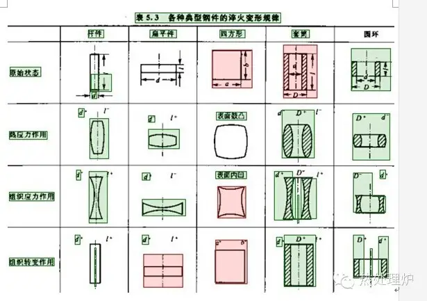 翘曲变形又包括形状变形和扭曲变形。扭曲变形主要是加热时工件在炉内放置不当,或者淬火前经变形校正后没有定型处理,或者是由于工件冷却时工件各部位冷却不均匀所造成的。这种变形可以针对具体情况分析解决。下面主要讨论体积变形和形状变形。