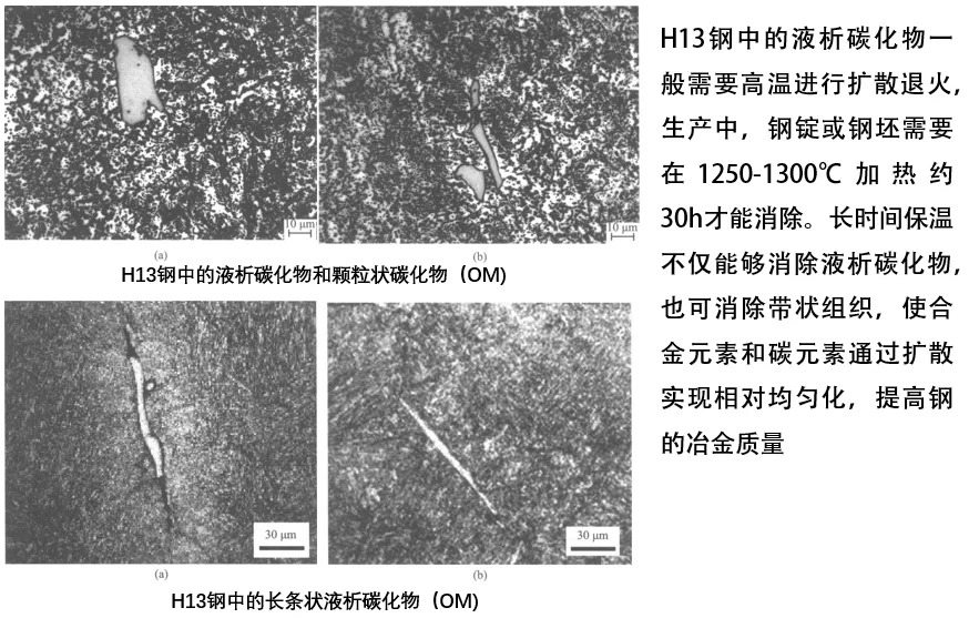 H13钢中的液析碳化物一般需要高温进行扩散退火。生产中,钢锭或钢坯需要在1250-1300℃加热约30h才能消除。长时间保温不仅能够消除液析碳化物,也可消除带状组织,使合金元素和碳元素通过扩散实现相对均匀化,大大提高钢的冶金质量。