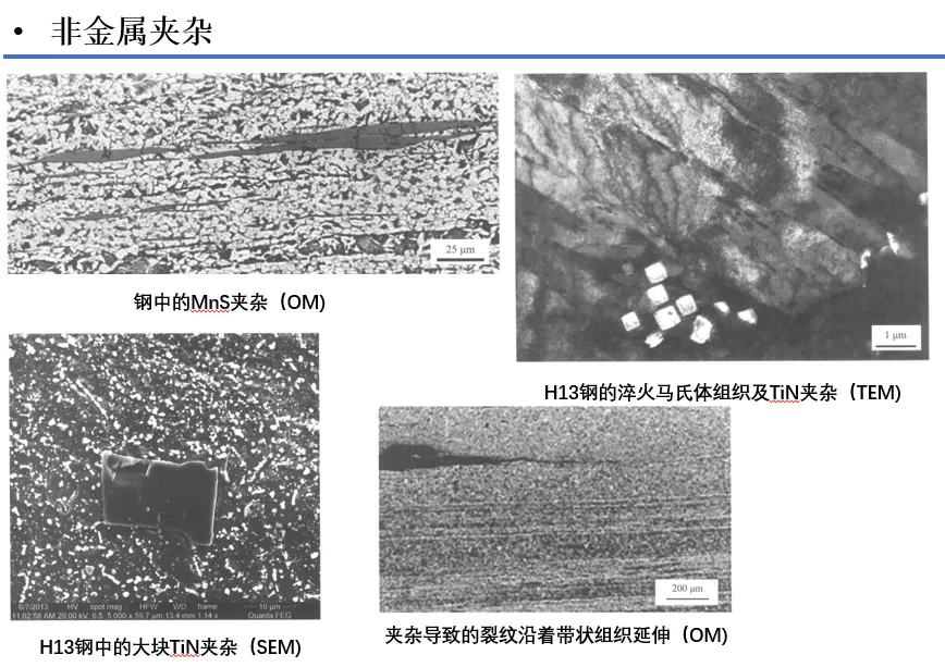 夹杂往往被看作显微裂纹的发源地,在疲劳裂纹和塑性加工中生成的裂纹也往往与夹杂存在密切关系。这可能是由于比较容易变形的金属在难以变形的夹杂周围塑性流动时,产生很大的张力而使金属和夹杂界面的联结断裂,形成空隙。还可能是由于夹杂周围的应力而使夹杂破碎,生成空隙。由于非金属夹杂破坏了钢基体的均匀性、连续性,还会在该 处造成应力集中,因此成为疲劳源(即疲劳裂纹的起始点)。在外力作用下,通常沿着夹杂与其周围金属基体的界面开裂,形成疲劳裂纹。在某些条件下,夹杂还会加速裂纹的扩展,从而进一步降低疲劳寿命。