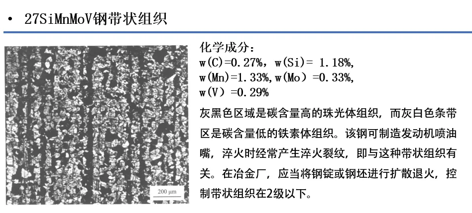 带状组织是钢中常见的冶金缺陷,带状组织影响钢的强韧性,尤其是降低纵向冲击韧性。热处理时易产生淬火裂纹。合金钢中的带状组织难以消除,一般需在1250℃以上加热30h才能消除。