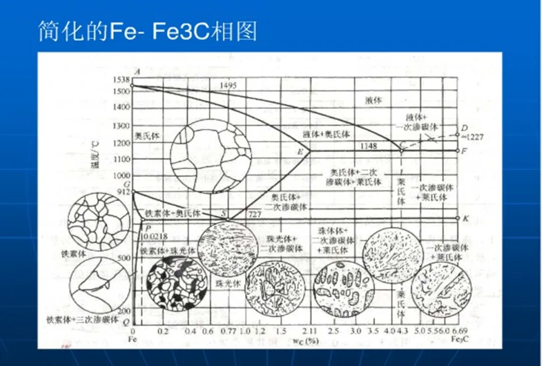 金相分析(Metallographic Analysis)是材料科学与工程领域中的一种重要研究方法,主要用于研究和表征金属及其合金的微观结构。通过金相分析,可以获取材料内部的晶粒形态、相分布、夹杂物、孔隙、析出物、变形特征以及其他微观结构特征的信息。这些微观结构直接影响材料的机械性能、物理性能以及化学性能,因此金相分析在材料设计、质量控制、失效分析等方面具有重要作用。金相分析在生产实际中常常称为金相检验,在材料研发、生产过程控制、故障诊断和质量保证中都是不可或缺的工具。 首先要明确金属和合金在固态下,通常都是晶体。 晶体就是原子在三维空间中有规则作周期重复排列的物质,就是说,在金属和合金中,原子的排列都是有规则的,而不是杂乱无章的。 晶体通常具有如下的特征: 1.均匀性; 2.各向异性; 3.能自发地组成多面体外形; 4.具有确定的熔点; 5.晶体的理想外形和内部结构都具有特定的对称性; 6.对X射线产生衍射效应。 金相检验的基础包括样品制备、腐蚀处理、显微观察和图像分析。样品制备涉及切割、镶嵌、研磨和抛光,以获得平滑的表面。腐蚀处理使用特定的化学试剂揭示材料的微观结构。显微观察通过光学显微镜、扫描电子显微镜(SEM)或透射电子显微镜(TEM)获取样品图像。图像分析则通过软件对显微图像进行定量和定性分析,以评估材料的微观结构和性能。 立方晶格(Cubic):立方晶格是最对称的晶格结构,其单位晶胞的三个边长相等,且每个角度都是90度。常见的立方晶格类型包括简单立方晶格(SC)、体心立方晶格(BCC)和面心立方晶格(FCC)。体心立方晶格中的原子不仅位于立方体的角落,还位于中心,而面心立方晶格在角落和每个面中心都布满了原子,这使得FCC晶格的密度通常较高。 四方晶格(Tetragonal):四方晶格的单位晶胞具有一个边长与另两个边长相等,且角度都是90度。四方晶格包括简单四方晶格和体心四方晶格。简单四方晶格的原子排列较为简单,而体心四方晶格则在简单四方晶格的基础上,在中心位置添加了一个额外的原子,使结构更复杂。 正交晶格(Orthorhombic):正交晶格的单位晶胞三个轴都互相垂直,但边长不相等。常见的正交晶格类型包括简单正交晶格、体心正交晶格(BCO)和面心正交晶格(FCO)。体心正交晶格在简单正交晶格的基础上添加了一个中心原子,而面心正交晶格则在每个面中心有额外的原子,形成更复杂的结构。 单斜晶格(Monoclinic):单斜晶格的单位晶胞具有两个轴互相垂直,第三个轴与这两个轴不垂直的特征。该晶格类型包括简单单斜晶格和体心单斜晶格。体心单斜晶格在简单单斜晶格中添加了一个中心原子,使得结构更加复杂。 三斜晶格(Triclinic):三斜晶格是最复杂的晶格类型,其单位晶胞的三个轴长度和相互夹角都不相等。没有任何轴与其他轴垂直,导致其晶胞形状较为不规则。三斜晶格的结构具有最低的对称性,因此在自然界中相对少见。 六方晶格(Hexagonal):六方晶格的单位晶胞具有两个边长相等,且底面为正六边形的结构。其轴长不同于底面轴,角度为120度和90度。简单六方晶格中的原子排列在一个六边形的底面上,结构具有较高的对称性。 罗顿晶格(Rhombohedral):罗顿晶格的单位晶胞中的三个轴长度相等,但轴间夹角不为90度,通常是60度或120度。虽然在几何上看起来像一个“斜方立方体”,但所有边长相等的特点使其成为一种对称的晶格结构。 相图中特性点符号及含义 特性点 温度(℃) 含碳量(%) 特性点的含义 A 1538 0 纯铁的熔点 B 1495 0.53 包晶转变的液态合金成分 C 1148 4.30 共晶点 D 1227 6.69 渗碳体熔点 E 1148 2.11 碳在奥氏体中最大溶解度 F 1148 6.69 共晶渗碳体成分点 G 912 0 a-Fe← →r-Fe同素异构转变点 H 1495 0.09 碳在ð-Fe中最大溶解度 J 1495 0.17 包晶点 K 727 6.69 Fe3C的成分 N 1394 0 r-Fe ← →ð-Fe同素异构转变点 P 727 0.0218 碳在ɑ-Fe中最大溶解度 S 727 0.77 共析点 Q 室温 0.0008 室温下碳在铁素体中溶解度 相图主要特性线 序号 线名及含义 1 AC线,液体向奥氏体转变的开始线,即:L→A 2 CD线,液体向渗碳体转变的开始线,即:L→Fe3CI ACD线统称为液相线,在此线以上合金全部处于液相状态,用符号L表示。 3 AE线,液体向奥氏体转变的终止线。 4 ECF线,水平线、共晶线。 AECF线统称为固相线,液体合金冷却至此线,全部结晶为固体,此线下为固相区 5 ES线,又称Acm线,是碳在奥氏体中溶解度曲线,即:L→Fe3CII 6 GS线,又称A3线。 7 GP线,是奥氏体向铁素体转变的终止线。 8 PSK线,共析线,又称A1线。 9 PQ线,碳在铁素体中的溶解度曲线。 相图的相区 1.单相区,简化的Fe-Fe3C相图中有F、A、L和Fe3C四个单相区。 2.两相区,简化的Fe-Fe3C相图中有L+A、L+Fe3C、A+F、A+FeC和F+Fe3C五个两相区。 每个两相区都与相应的两个单相区有相邻两条三相共存线,即: 共晶线:ECF、L、A和Fe3C三相共存。 共析线:PSK、A、F和Fe3C三相共存。 铁碳合金的基本相 基本相 定 义 力学性能 容碳量 铁素体F 碳在ɑ-Fe中的间隙固溶体 强度、硬度低,塑性、韧性好 最大0.02% 奥氏体A 碳在γ-Fe中的间隙固溶体 硬度低、塑性好 最大2.14% 渗碳体Fe3C Fe与C的金属化合物 硬而脆 最大6.7% AC1 – 加热时,珠光体向奥氏体转变的开始温度。 Ar1 – 冷却时,奥氏体向珠光体转变的开始温度。 AC3 – 加热时,先共析铁素体全部转变为奥氏体的终止温度。 Ar3 – 冷却时,奥氏体开始析出先共析铁素体的