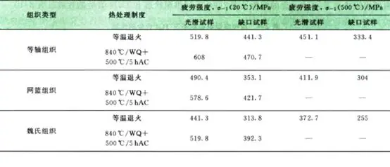 在对称循环高频应力作用下,光滑试样的疲劳强度与组织类型密切相关。研究表明,等轴组织的疲劳强度优于片状组织,同时,组织越细小,疲劳性能越好。在四种典型组织状态中,等轴组织的疲劳性能最好,其次是双态组织,再次是网篮组织,魏氏组织的疲劳性能最差。表7展示了不同组织对TC6合金疲劳性能的影响。