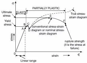 继续增加应力,曲线达到最大值。最大值对应抗拉强度,这是曲线的最大应力值,由图中的M表示。断裂点是材料最终断裂的点,由图中的F表示。