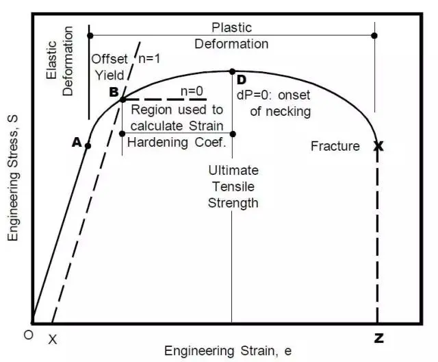 在实际的拉伸曲线上看,大多数金属在室温条件下发生屈服后,在屈服应力作用下,变形不会继续,继续变形必须增加阻力。在真应力-真应变曲线上表现为流变应力不断上升,出现加工硬化现象。这样的曲线称为加工硬化曲线。 加工硬化指数n是一个重要的塑性指标,它代表材料抵抗继续变形的能力。
